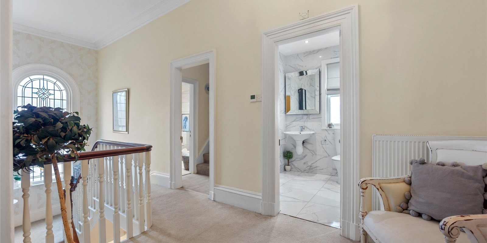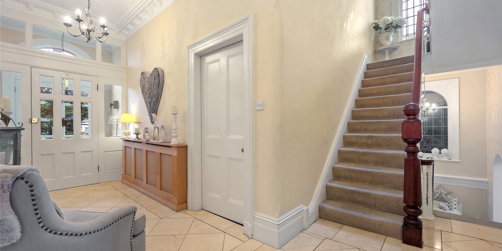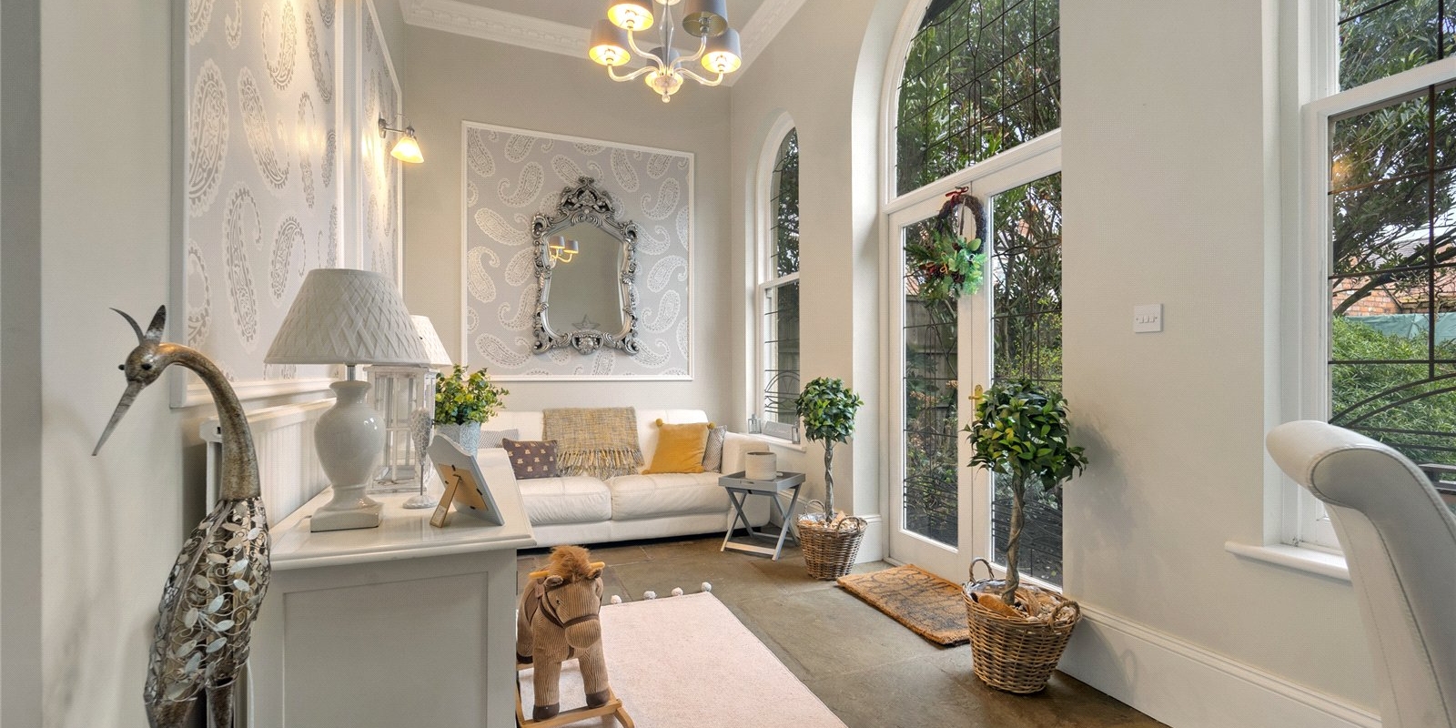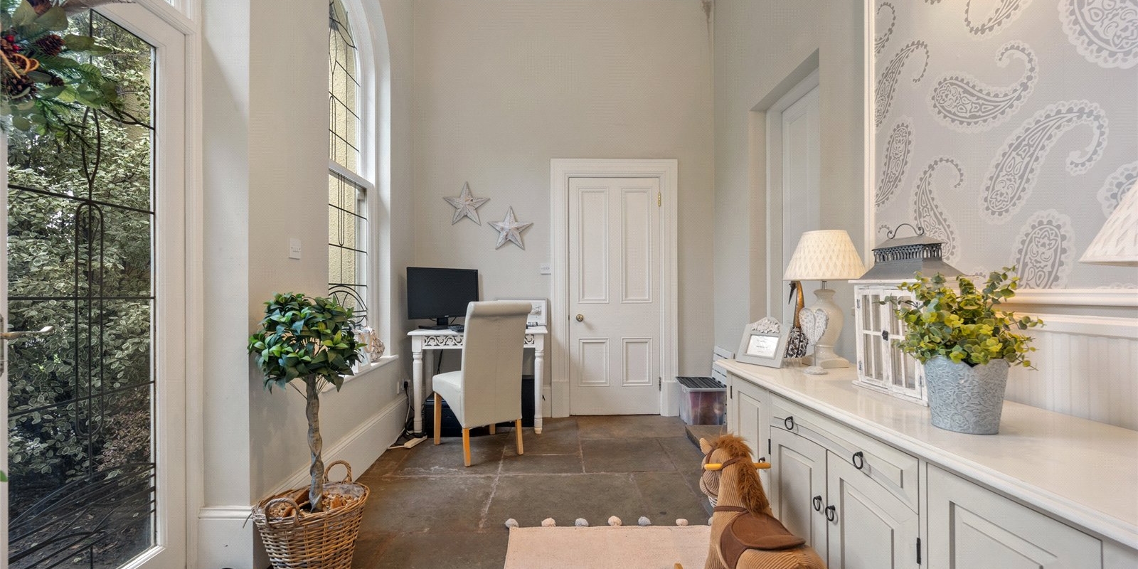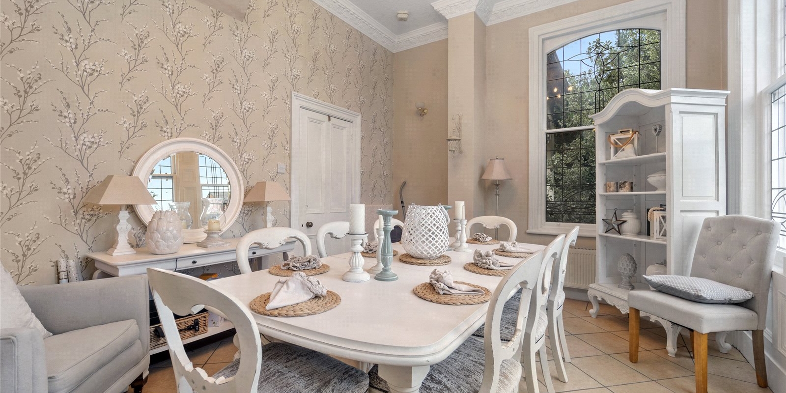 From the moment you step inside, the property exudes charm and sophistication. Original stained glass features, decorative wall panelling, and large light-filled windows create an atmosphere of understated luxury, while the interiors have been thoughtfully curated with tasteful décor and high-quality finishes throughout.