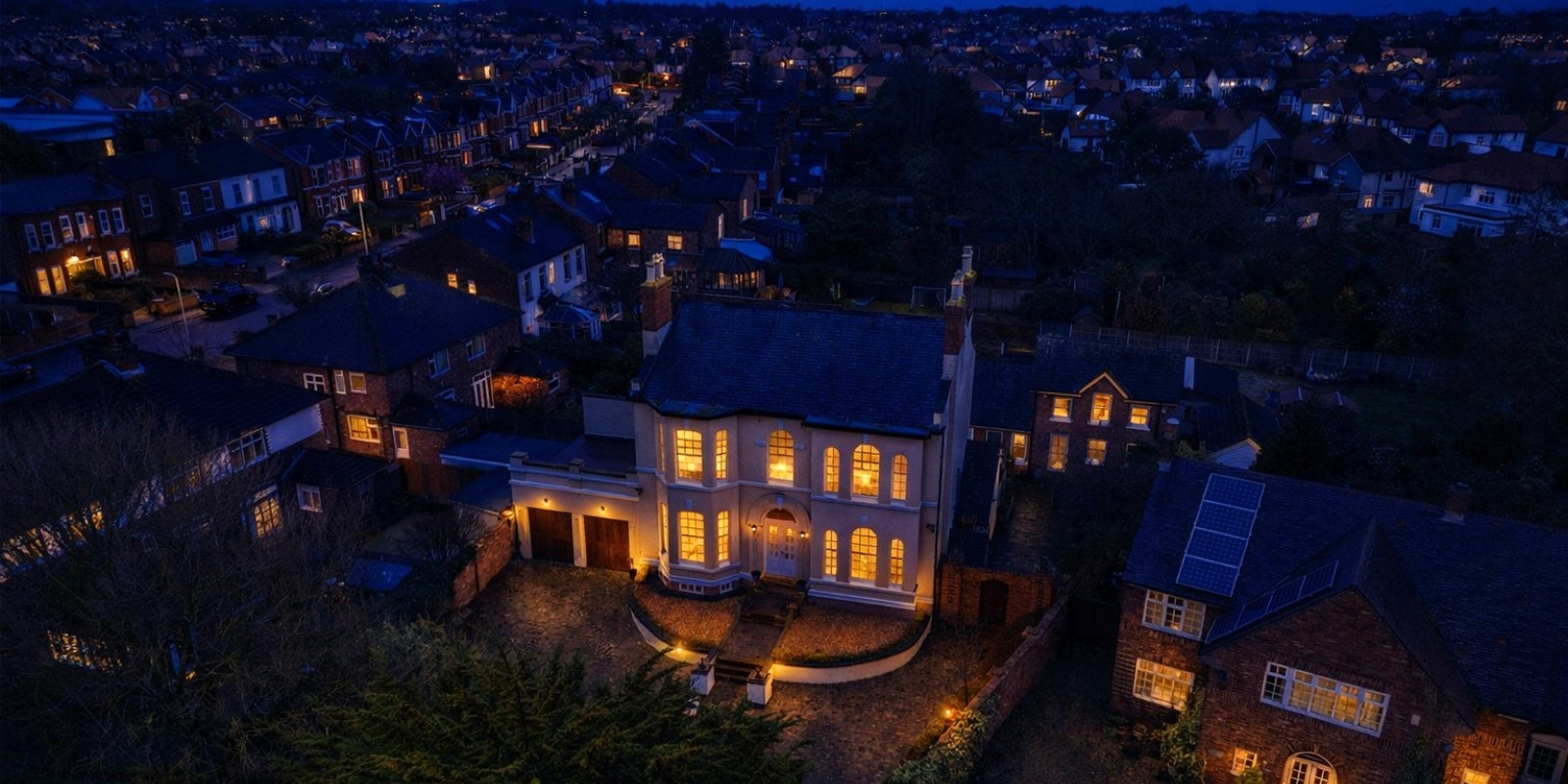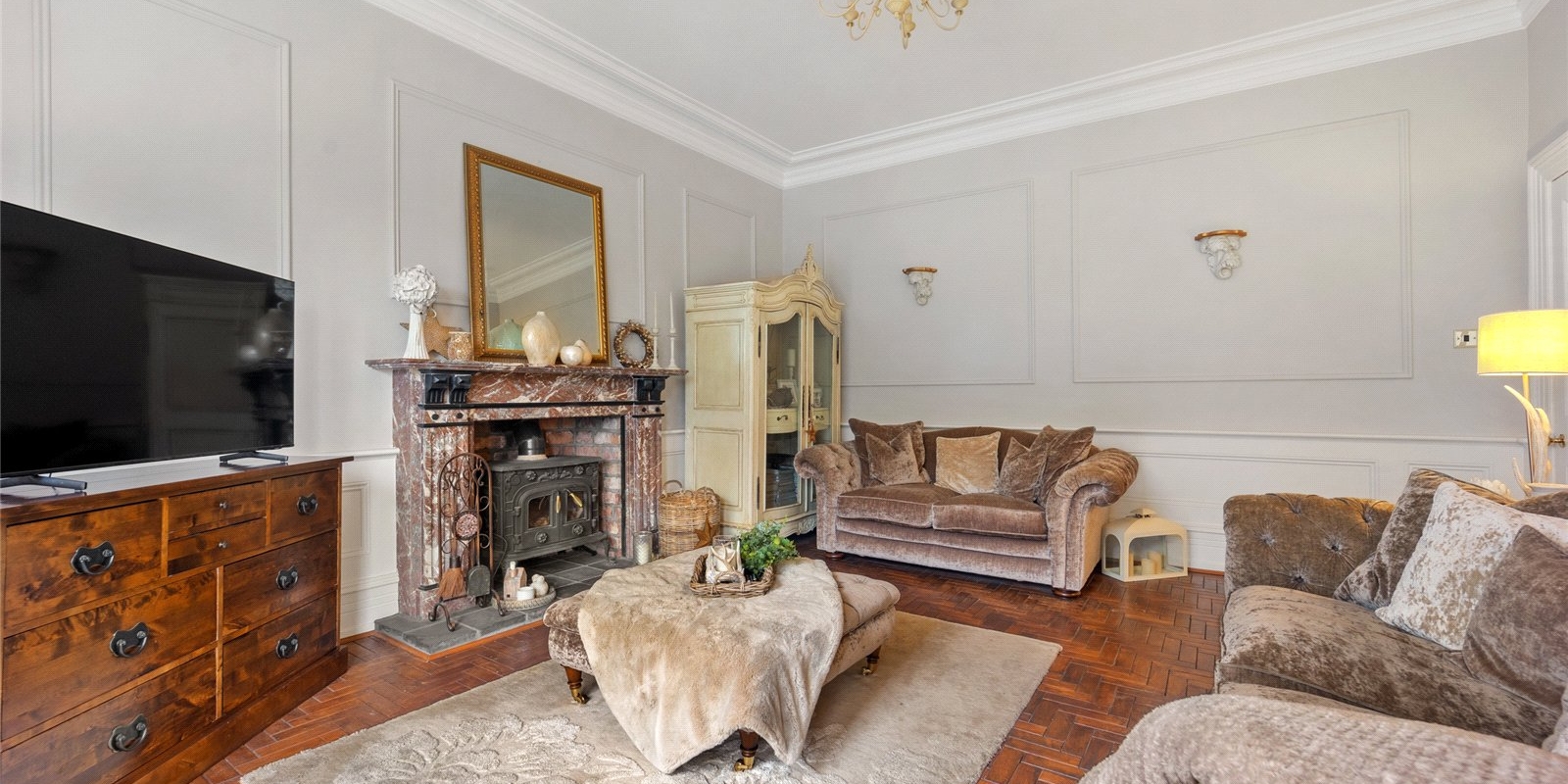 Set behind secure gates with a private driveway perimetered by lamp posts and greenery, this truly outstanding detached residence offers an exceptional opportunity to acquire a distinguished and beautifully appointed family home. Arranged over three impressive floors, the property seamlessly blends timeless character with refined contemporary living, creating a home of remarkable warmth, elegance, and versatility.
