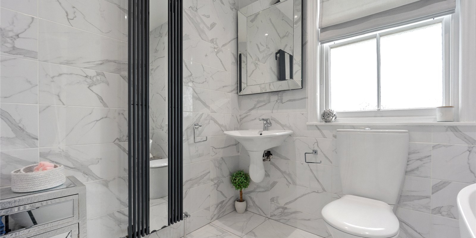 Ascending to the first floor, you will find three beautifully presented bedrooms, including a luxurious principal suite complete with a contemporary en-suite bathroom featuring a sleek walk-in shower. The family bathroom is finished in calming neutral tones and offers both a freestanding bath and in the second family bathroom is a separate shower, creating a relaxing environment.