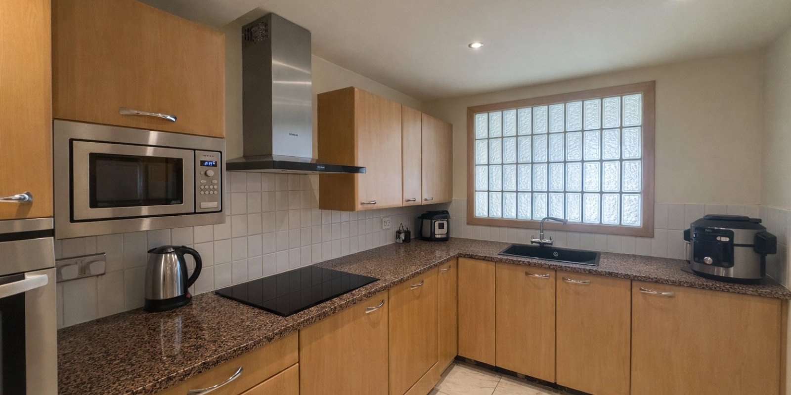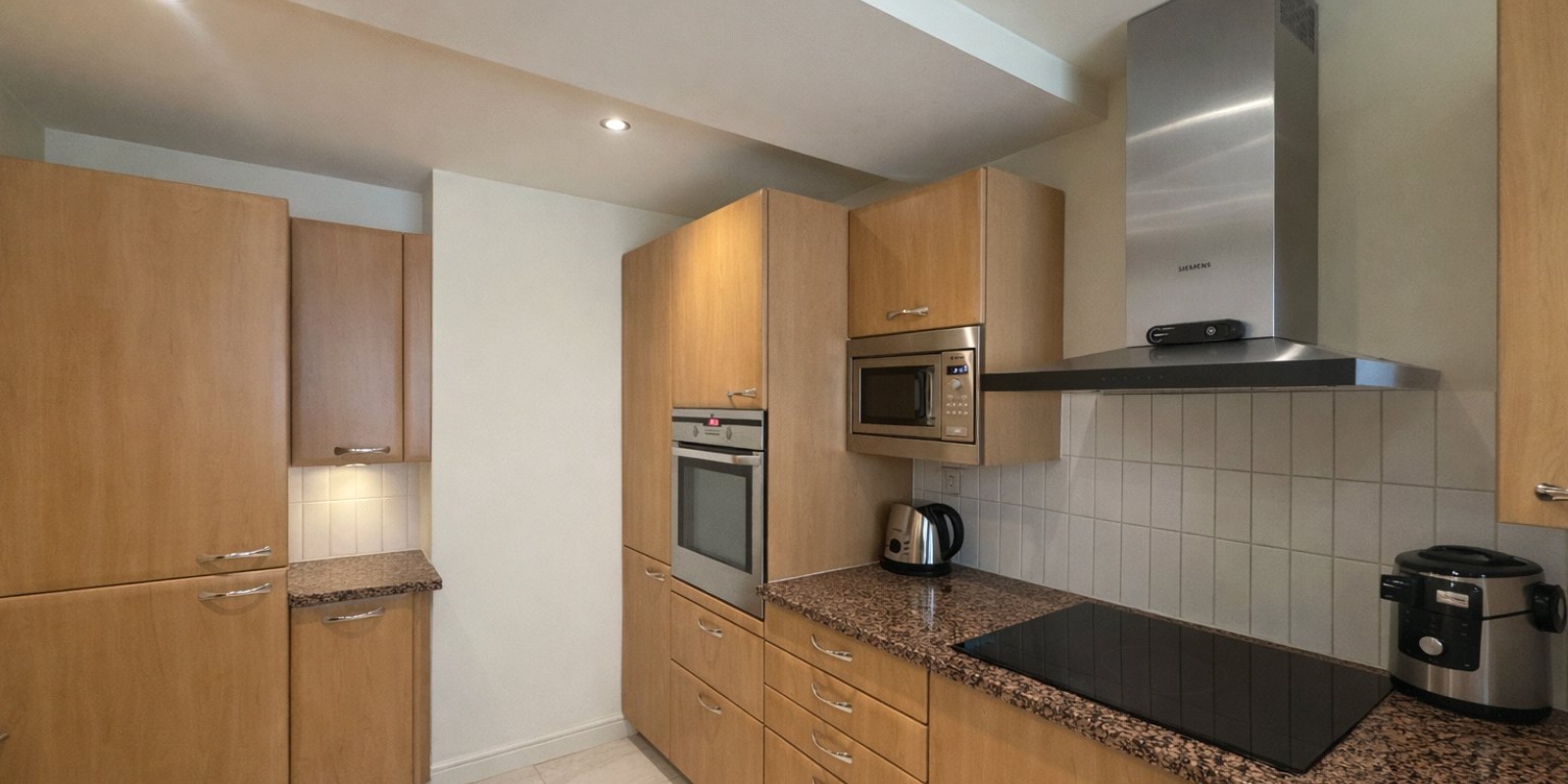 Kitchen - 12' 6" x 7' 10" (3.81m x 2.39m) Range of modern wall & base units with complimentary work surface, inset 1 1/2 sink with drainer & mixer tap over, tiled splash backs, integrated electric hob & oven, integrated microwave, integrated fridge freezer, integrated dishwasher, integrated washing machine, tiled flooring, feature window to the lounge, recessed ceiling with spotlights, heated towel rail and electrical points.