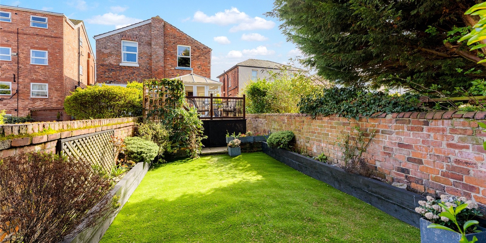To the rear, a bright and airy conservatory creates an additional reception space, enjoying a sunny aspect and pleasant views over the garden. This leads directly onto a raised terrace—perfect for outdoor dining—while steps descend to a beautifully maintained, private garden, offering a peaceful retreat with a high degree of seclusion. A useful side access adds further practicality.