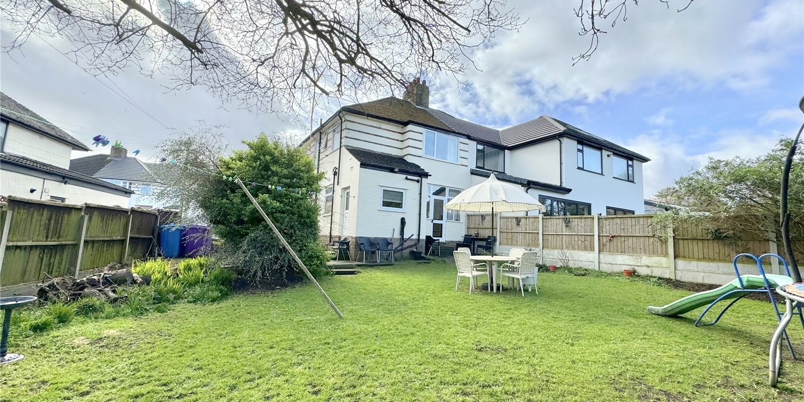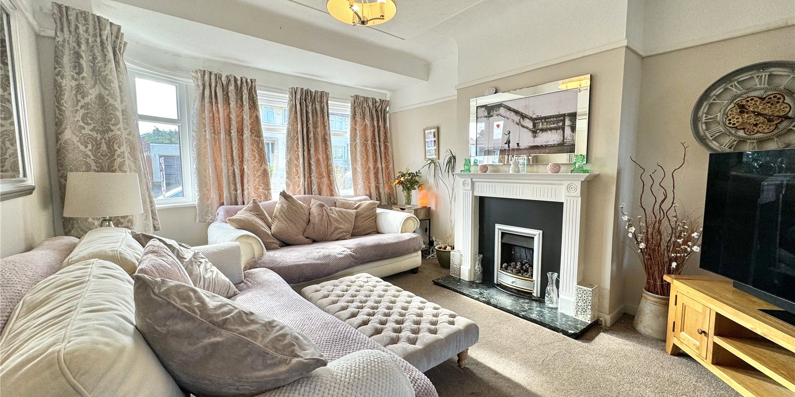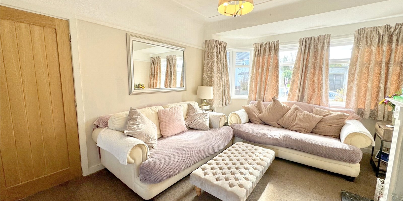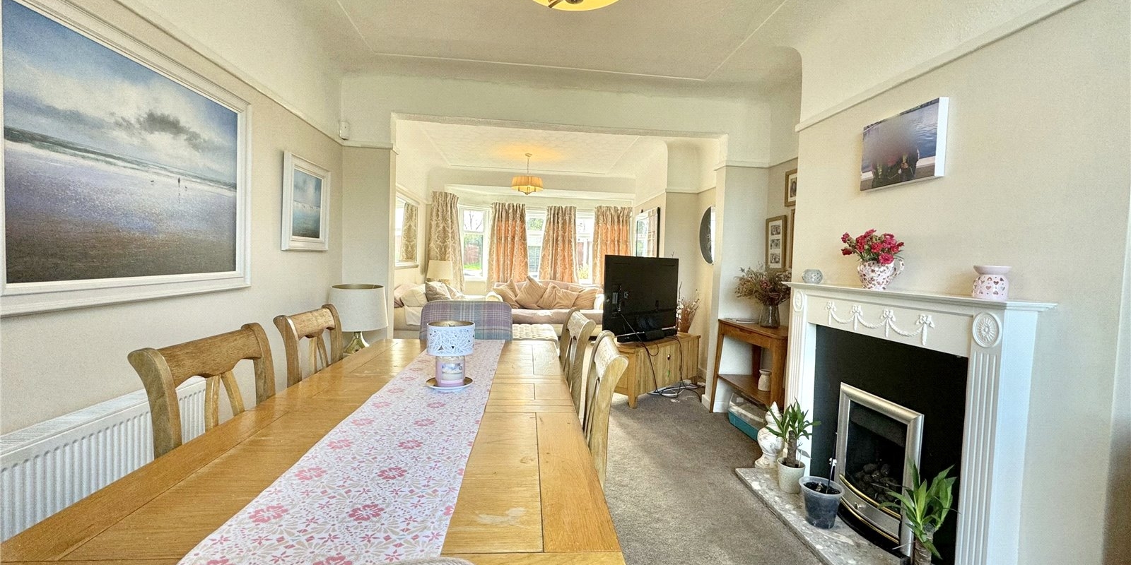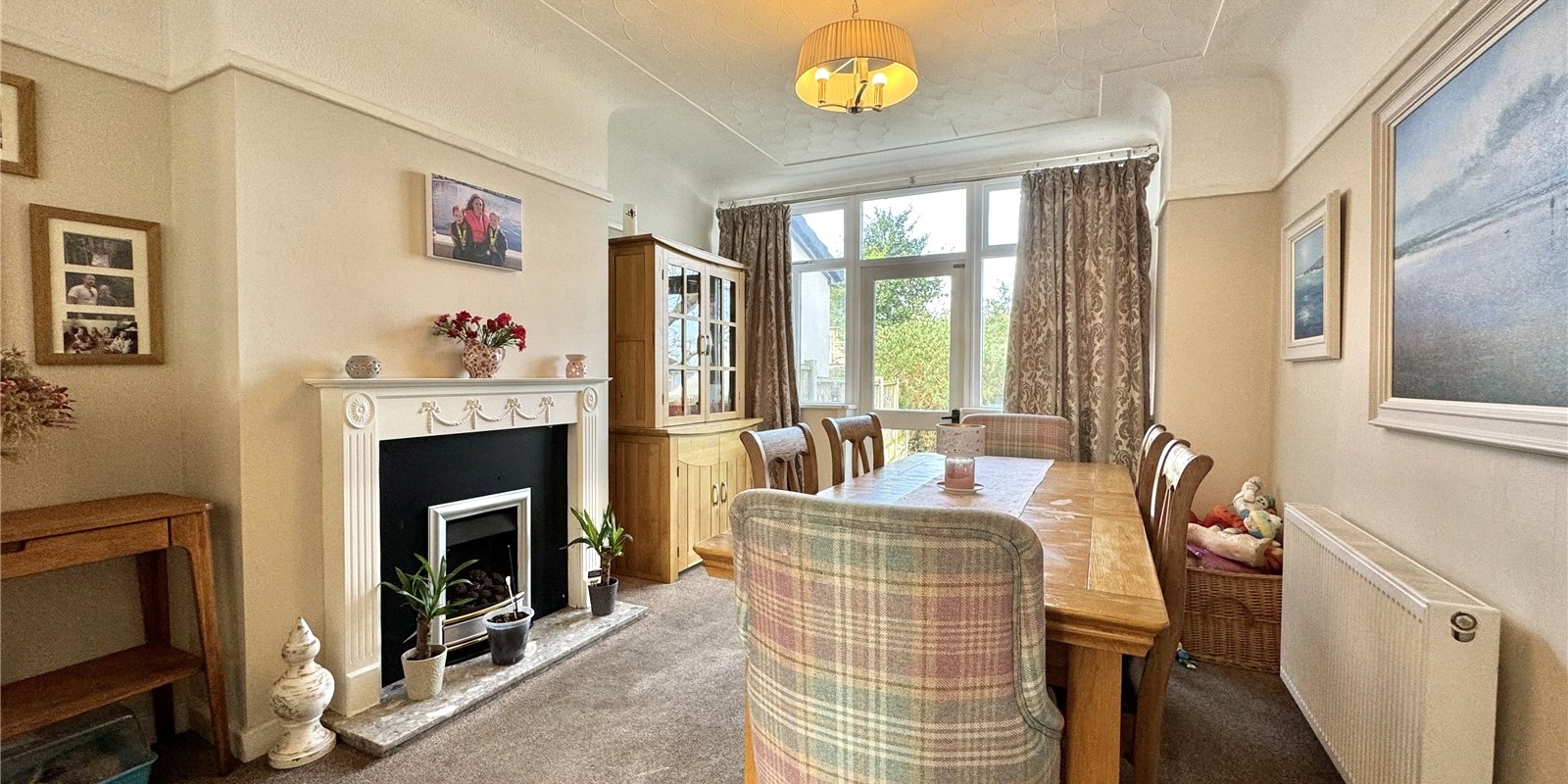 The property is approached via a driveway for off road parking. Upon entering, you are greeted by a welcoming entrance hall which provided access to a generous front facing living room with bay windows complete with fireplace, the dining room is rear facing and has a feature fireplace with doors leading out onto the beautiful garden. There is a fully fitted kitchen, with plenty of cupboard space, and built in appliances..