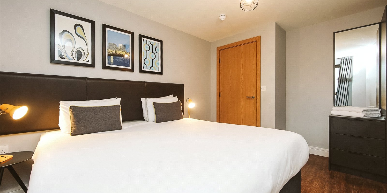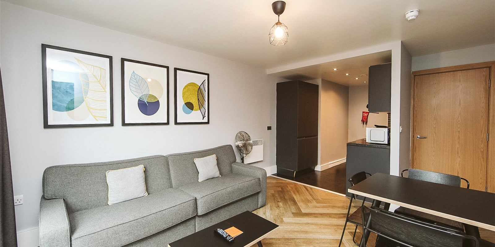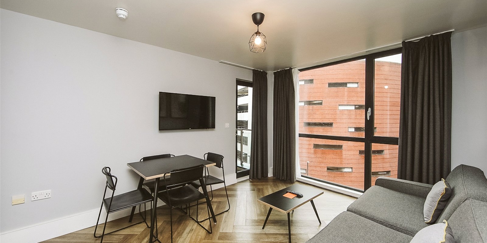 Located in the heart of Liverpool City Centre, this stylish one-bedroom flat offers modern urban living just moments from Liverpool One and Central Station. Situated on the upper floor of a secure development, the property features a bright open-plan living space with floor-to-ceiling windows, a contemporary kitchen, and a partitioned bedroom area.