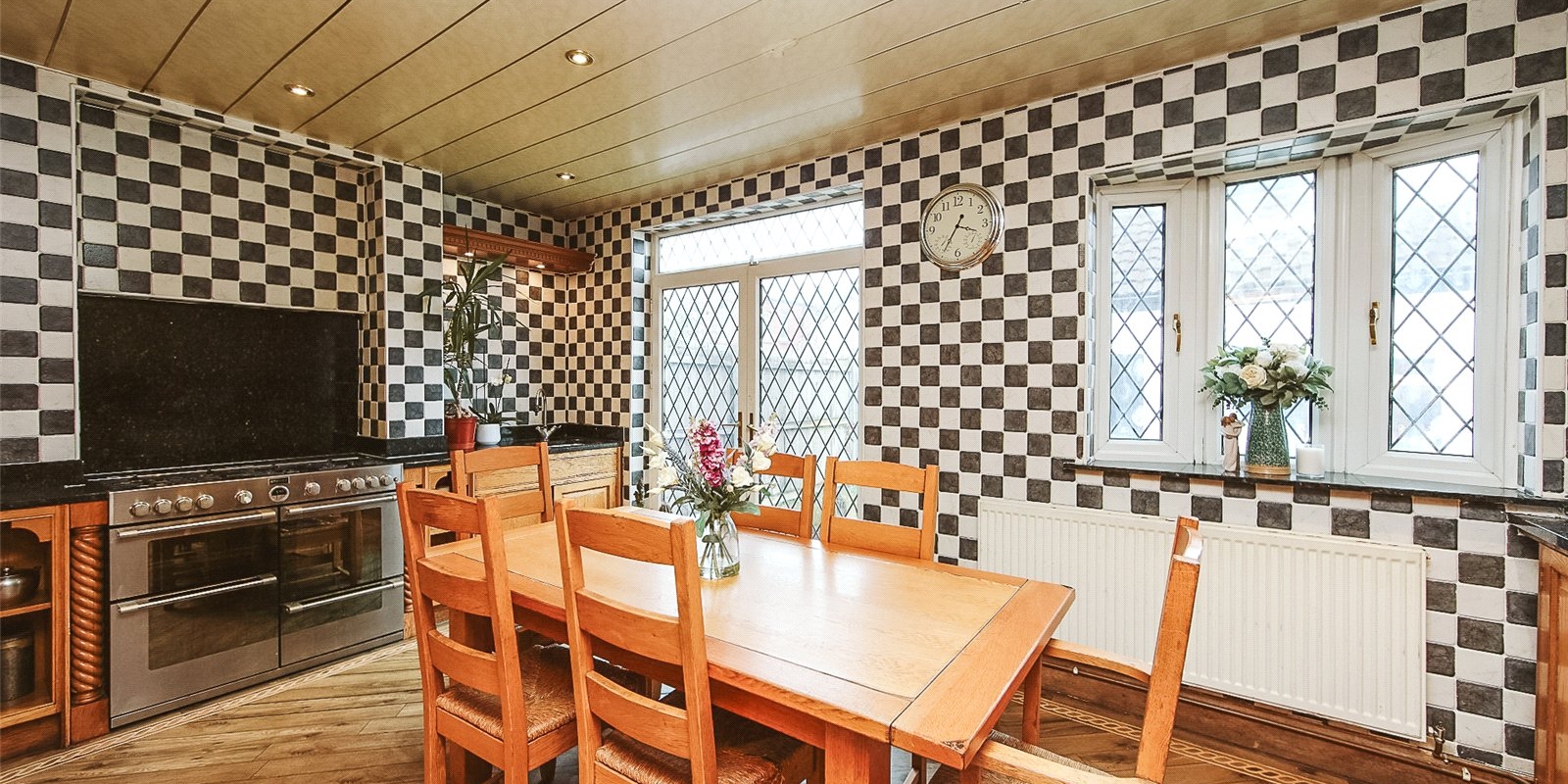 The house offers a bright and open space throughout, as you enter into a large hallway leading off into the primary reception room at the front of the house. The kitchen is beautifully finished with natural wood, with space for a full dining table and chairs at the centre.