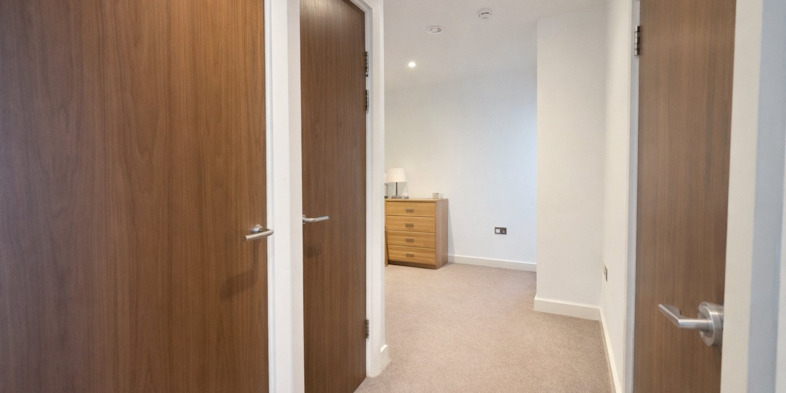 Both bedrooms are well-proportioned and thoughtfully designed to provide comfortable sleeping spaces with room for storage. A modern bathroom and additional hallway storage complete the internal layout, ensuring practicality matches the apartment’s aesthetic appeal.