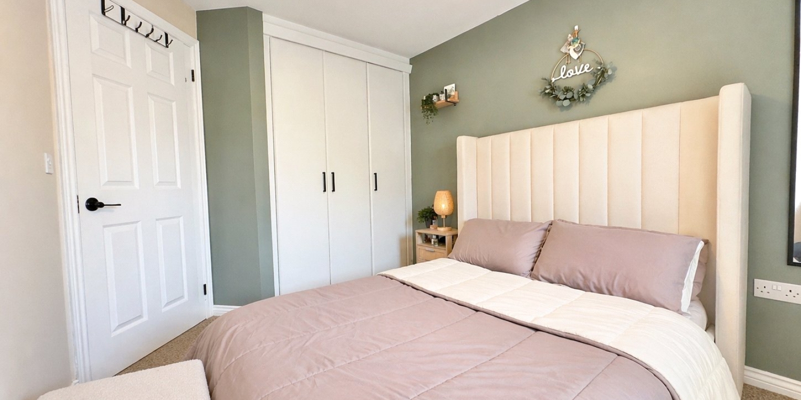 Two double bedrooms provide generous space for relaxation, while a modern three-piece bathroom suite with an overhead shower completes the home. Additional storage is available in a convenient hall cupboard, enhancing the apartment’s functionality.
