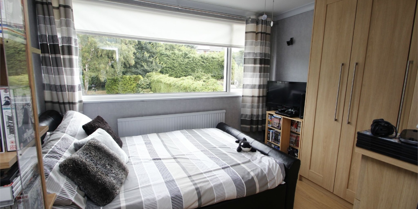 UPVC picture window to the rear elevation enjoying views over the landscaped rear garden, radiator, a range of built in wardrobes with soft cream door fronts and brush chrome handles and shelf, radiator.