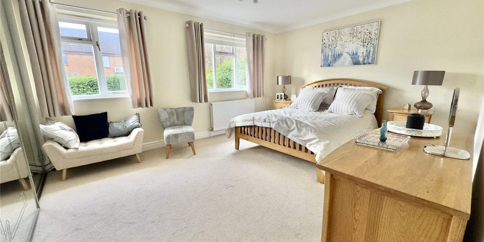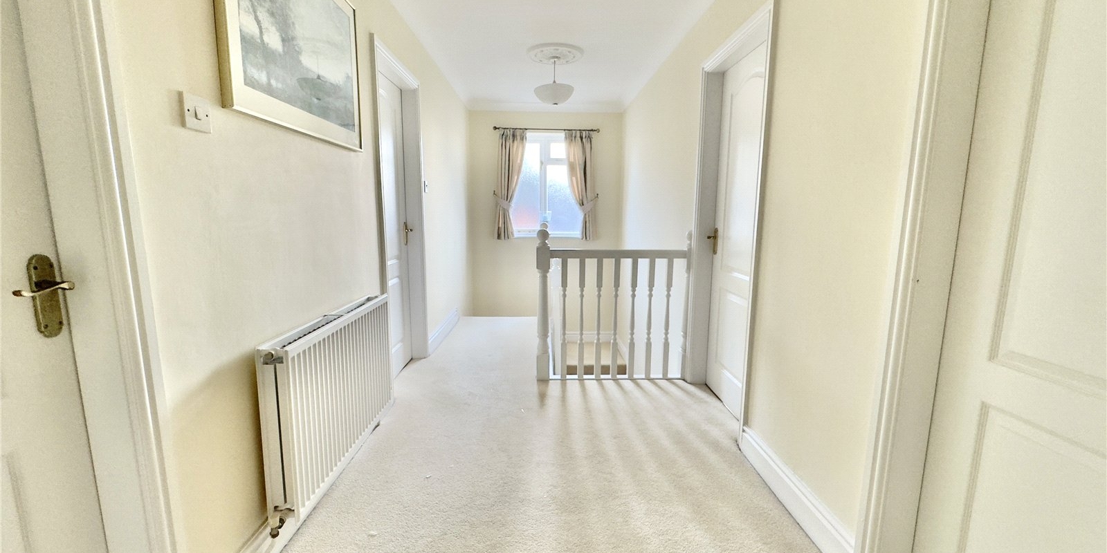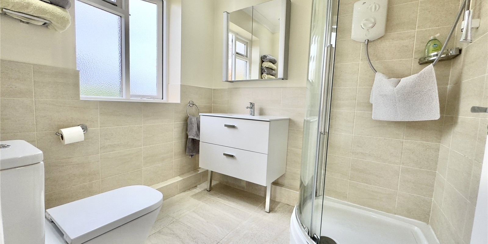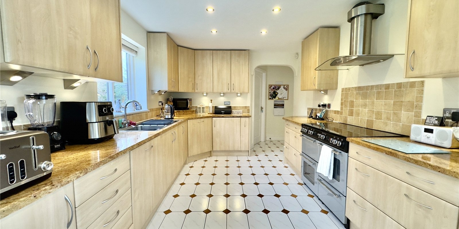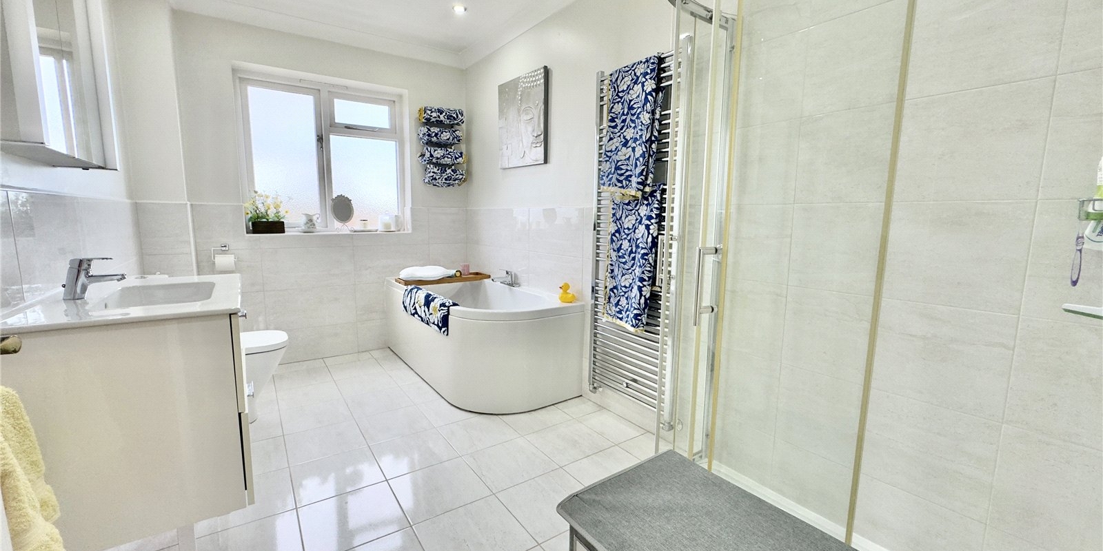 On the first floor, the generous master bedroom benefits from a modern en-suite shower room, alongside three further double bedrooms and a large four-piece family bathroom. Loft access from the landing offers additional storage space.