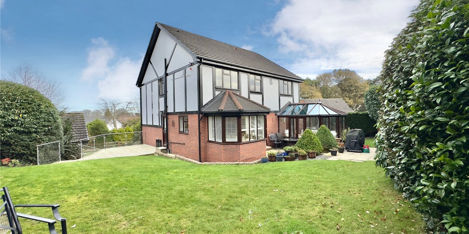 The property enjoys wrap-around gardens, including a sweeping south-facing lawn, a raised decked area with glass balustrade, and a paved patio, all beautifully framed by mature planting. There is ample off-road parking for multiple vehicles and a detached double garage.