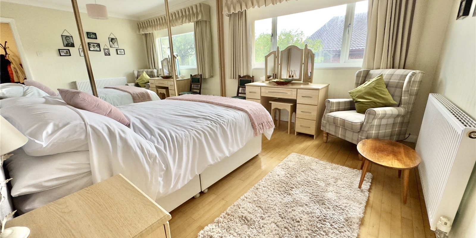 To the opposite side of the bungalow, a second hallway gives access to three generously sized double bedrooms, all of which feature built-in wardrobes. This area also includes two useful storage cupboards and a large four-piece family bathroom.