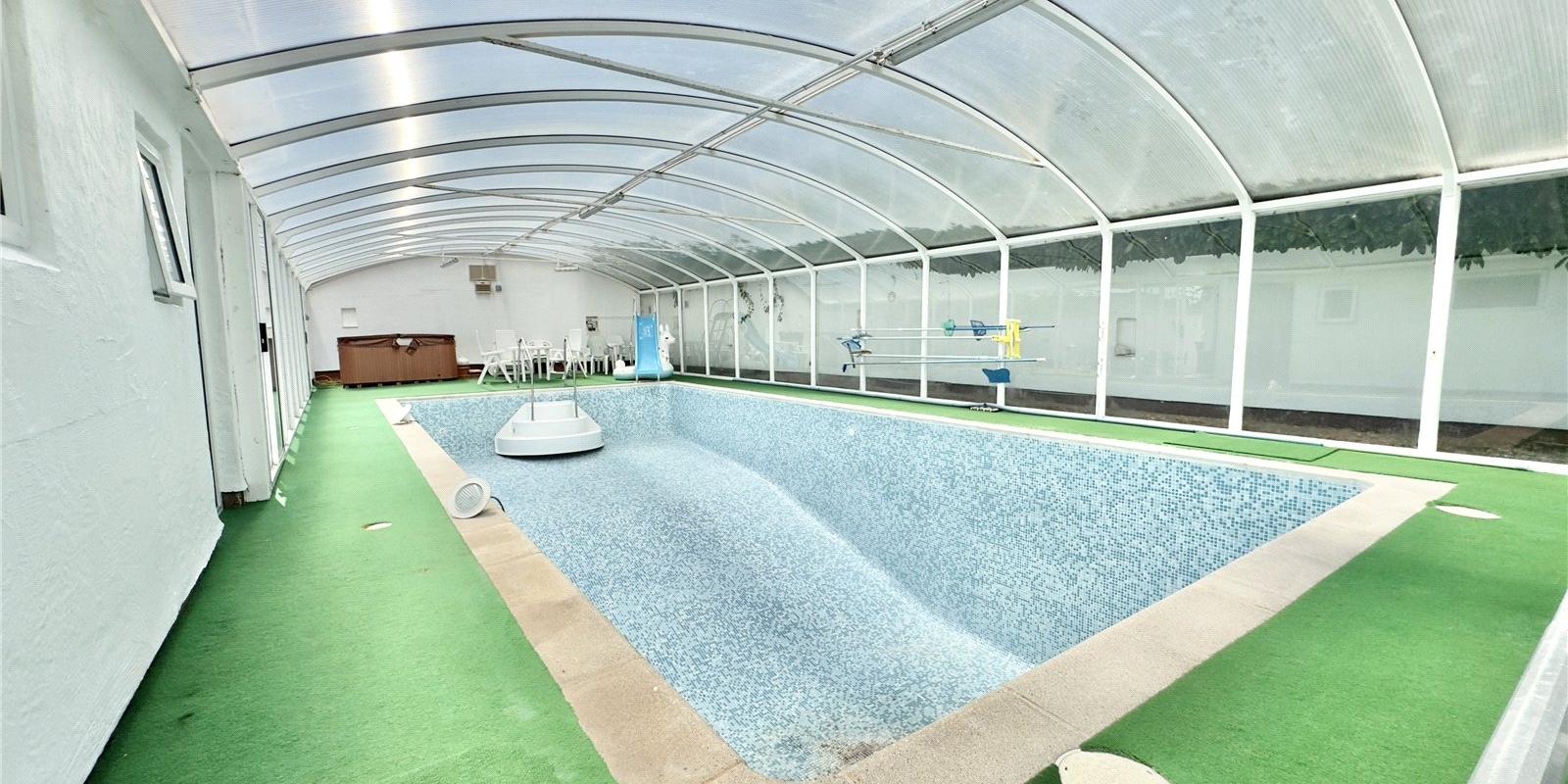 A standout feature of this exceptional home is the indoor swimming pool, complete with its own changing room, WC, and shower – creating a private leisure experience that can be enjoyed year-round.