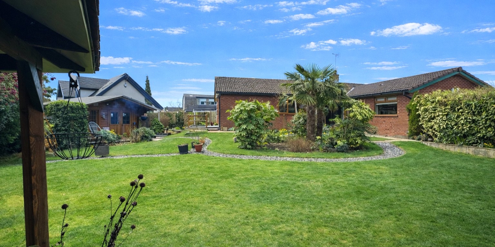 Externally, the property sits within stunning wrap-around gardens that have been thoughtfully landscaped and maintained. The outdoor space features a charming pond, well-stocked flower beds, a pavilion, and a well-built wooden cabin, creating a peaceful setting ideal for relaxing or entertaining.