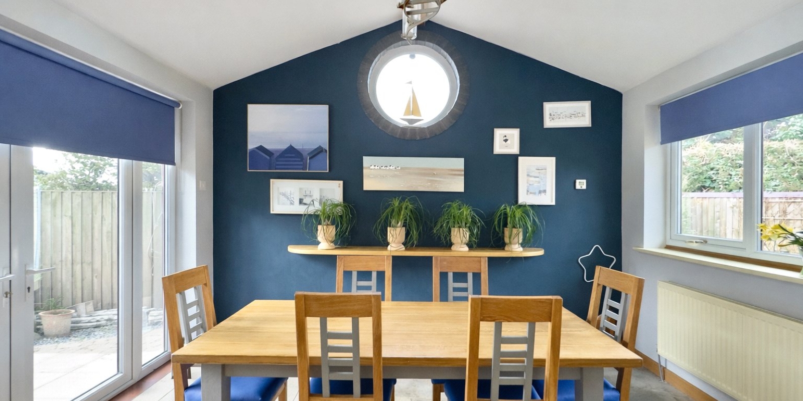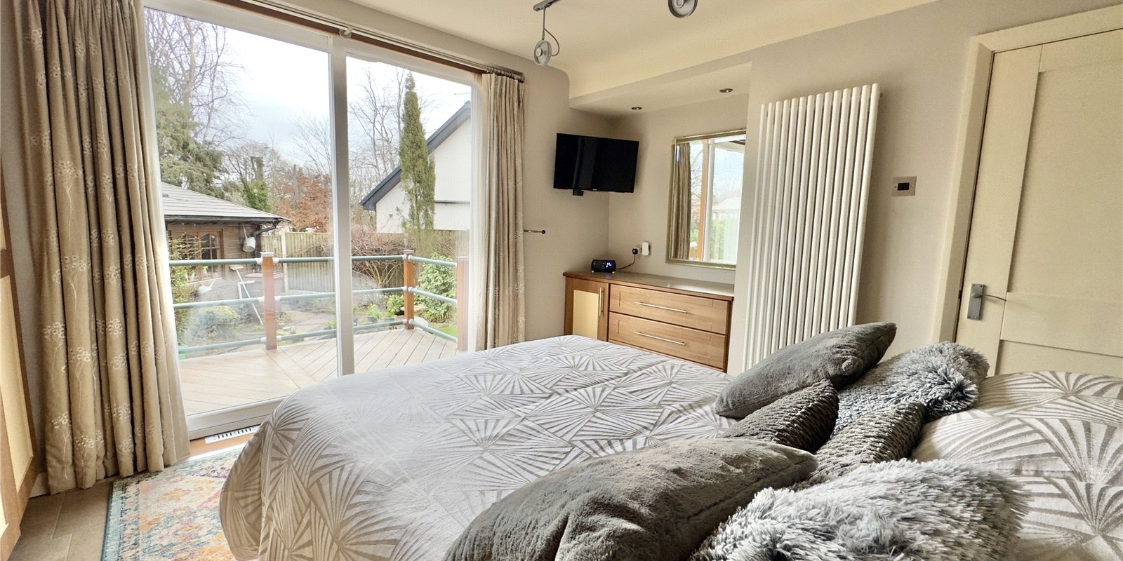 To the rear of the property there are three well-proportioned bedrooms. The master bedroom benefits from built-in wardrobes and doors opening out onto a private decked seating area. These bedrooms are served by a beautifully appointed four-piece family bathroom.