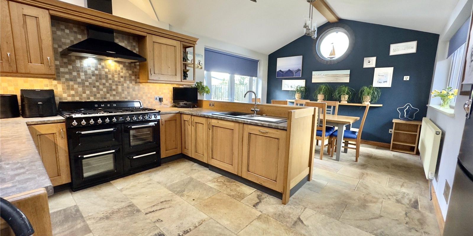The kitchen diner is accessed from the second reception room and provides a wonderful space for both everyday living and entertaining. The kitchen is fitted with an integrated Smeg range cooker, along with integrated appliances and space for additional large appliances. Underfloor heating adds a touch of luxury, while Velux windows and French doors allow plenty of natural light and provide direct access to the garden.