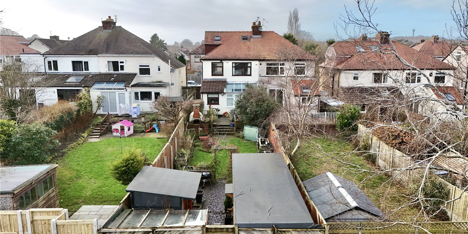 Externally, the property features a tarmacked driveway to the front, providing off-road parking. The large, sunny rear garden offers multiple zones for enjoyment, starting with a decked area ideal for outdoor entertaining, followed by a lawn area perfect for relaxing or children’s play. At the rear of the garden, there is a shed and a power-equipped cabin and a purpose built bar/ summerhouse with a brick built pizza oven and gym Additionally, there is rear access to the common area.