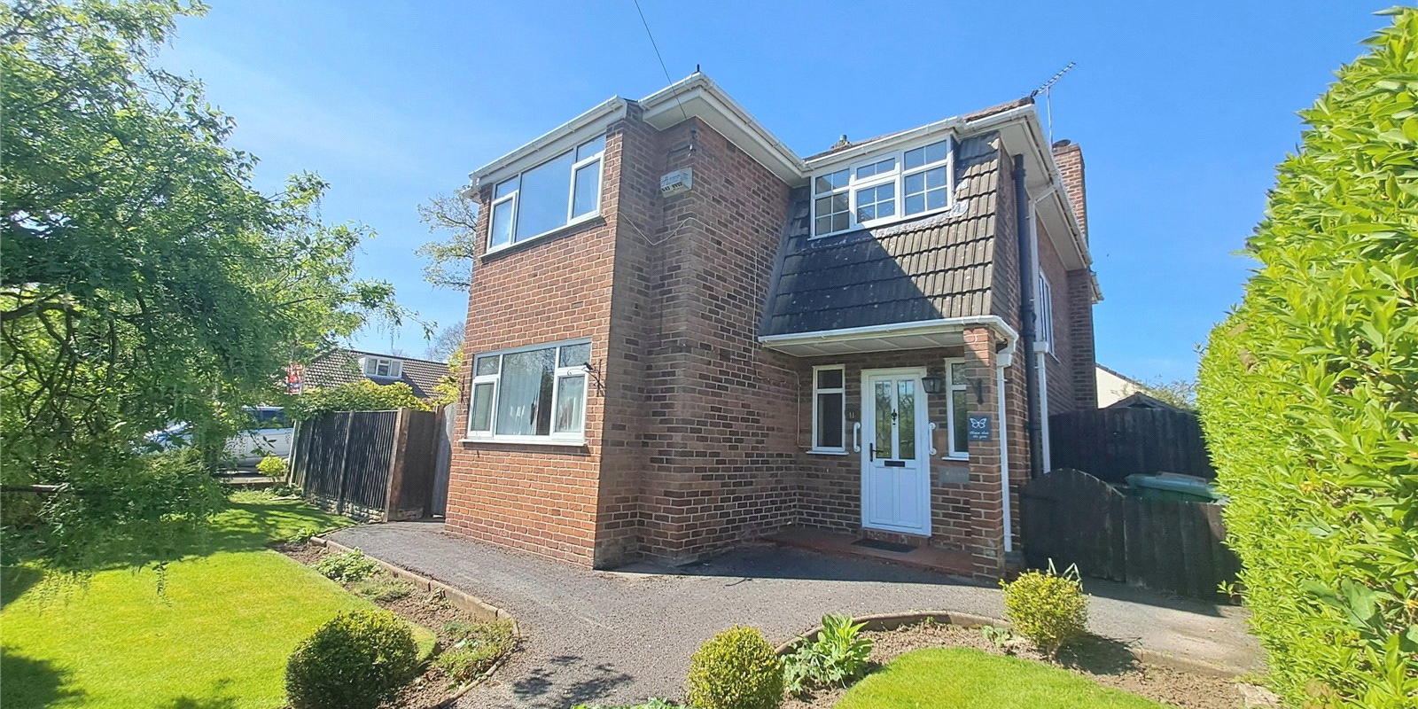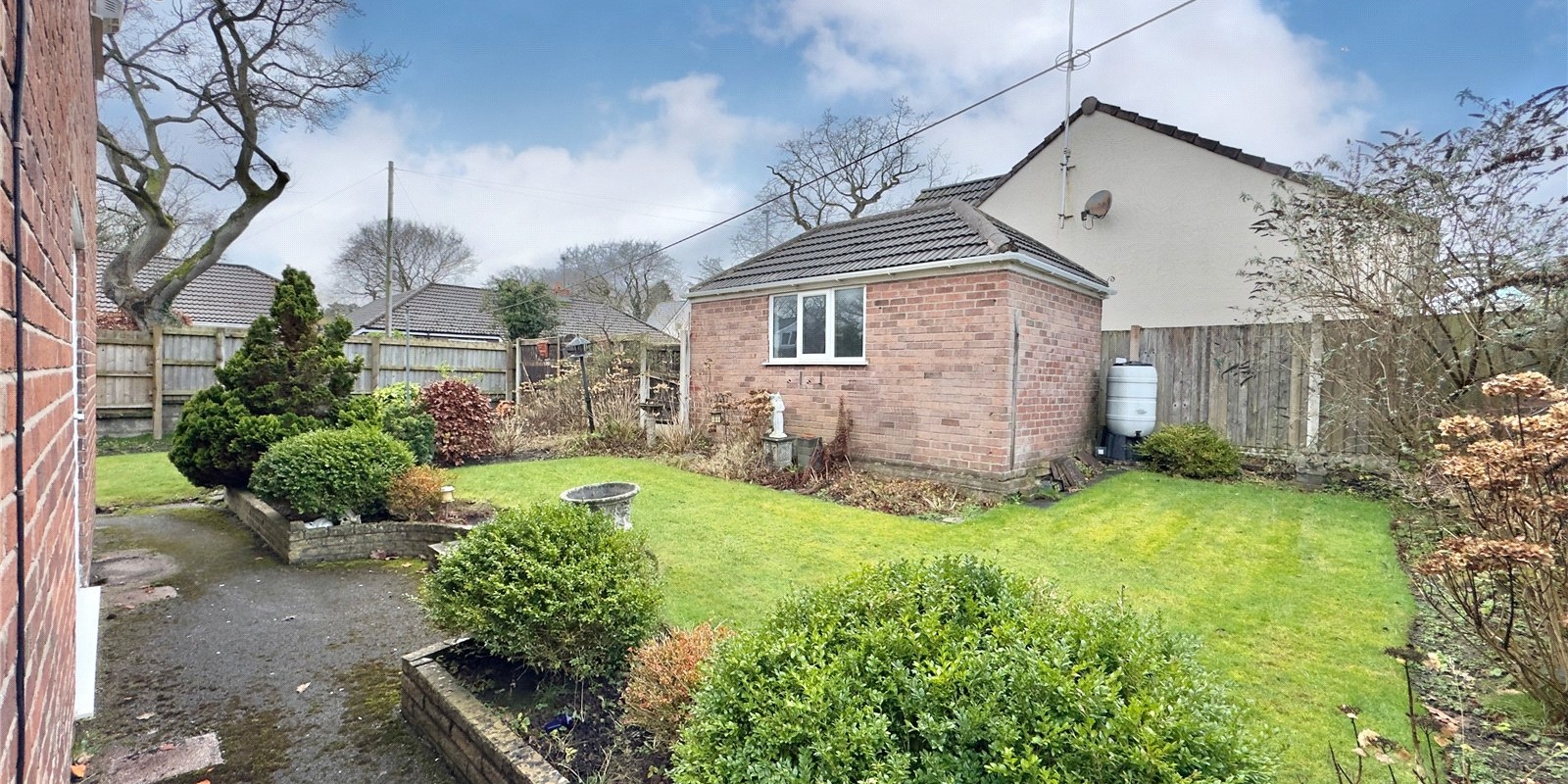 Externally, the property occupies an enviable corner plot with gardens to the front, side, and rear, providing a good degree of privacy and outdoor space. A driveway offers off-road parking, and a detached garage is positioned to the rear of the property.