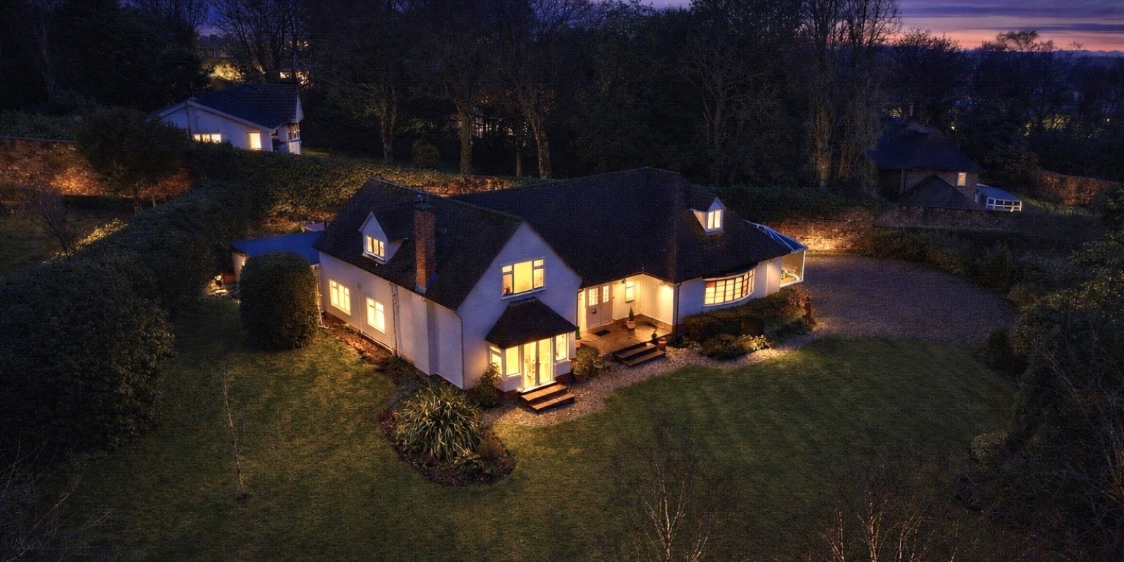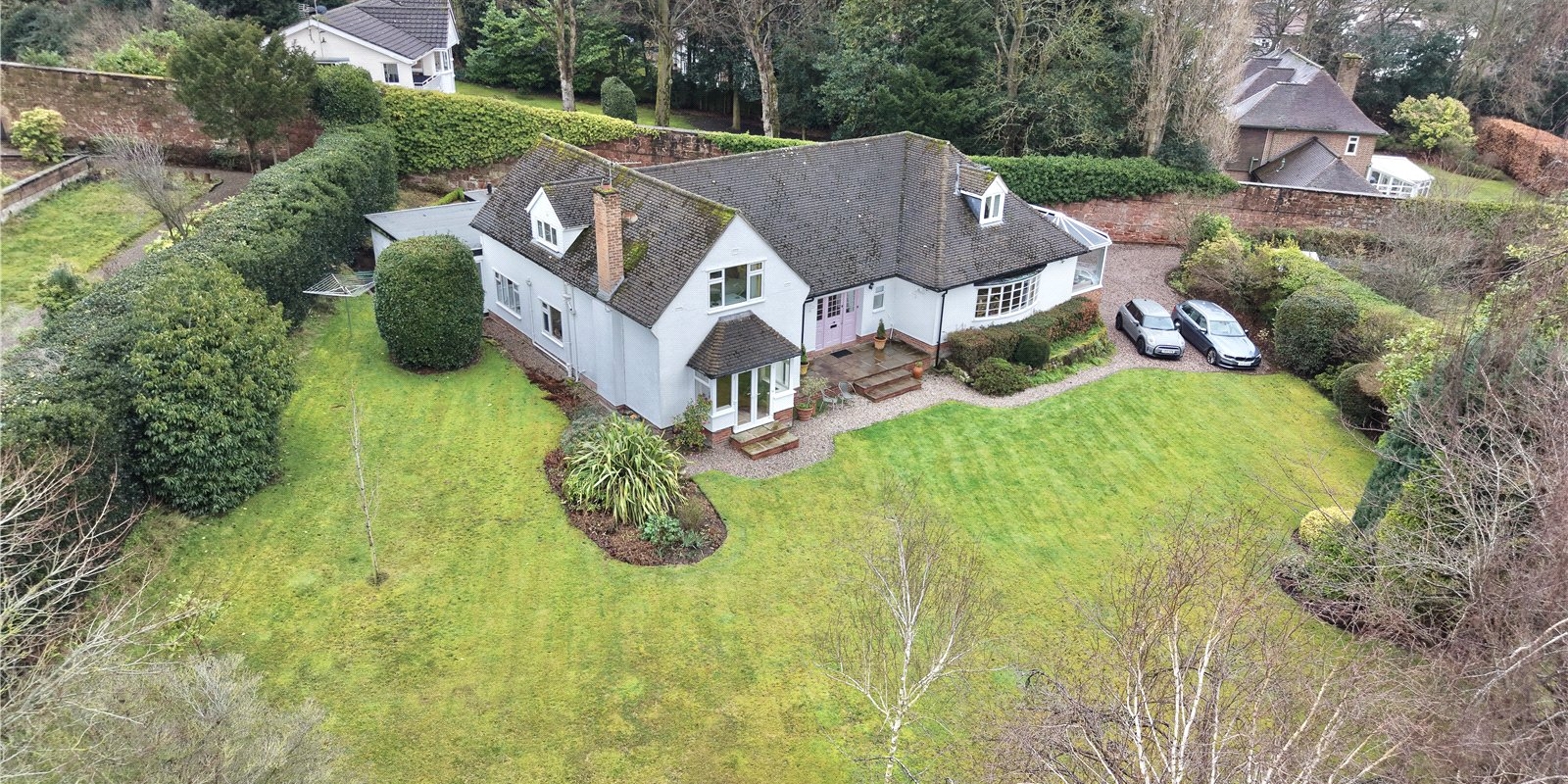 The property sits within beautifully maintained grounds, enclosed by established greenery, sandstone walls, and mature trees. A well-kept lawn wraps around the property, complemented by a flagged patio area ideal for outdoor seating. There is also ample off-road parking.