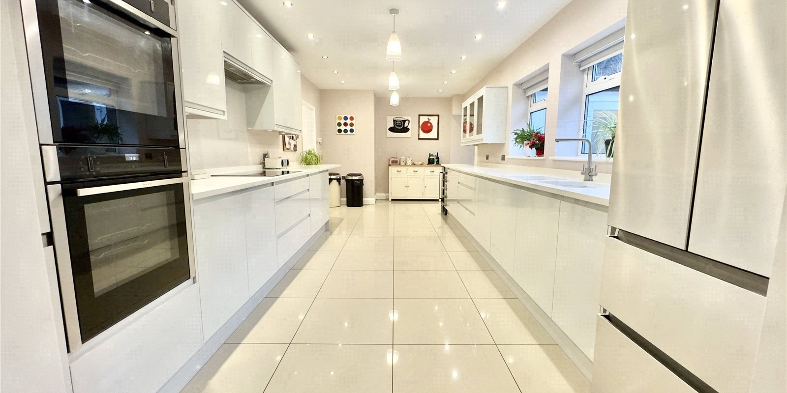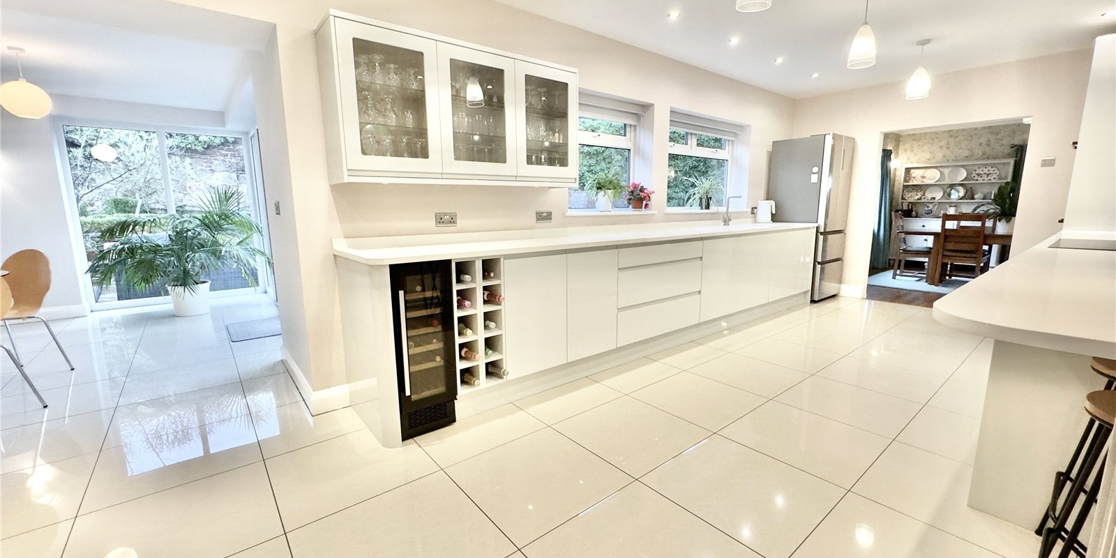 The kitchen flows seamlessly into a bright breakfast room, which benefits from floor-to-ceiling windows running the full length of the room and French doors opening onto a private patio area.