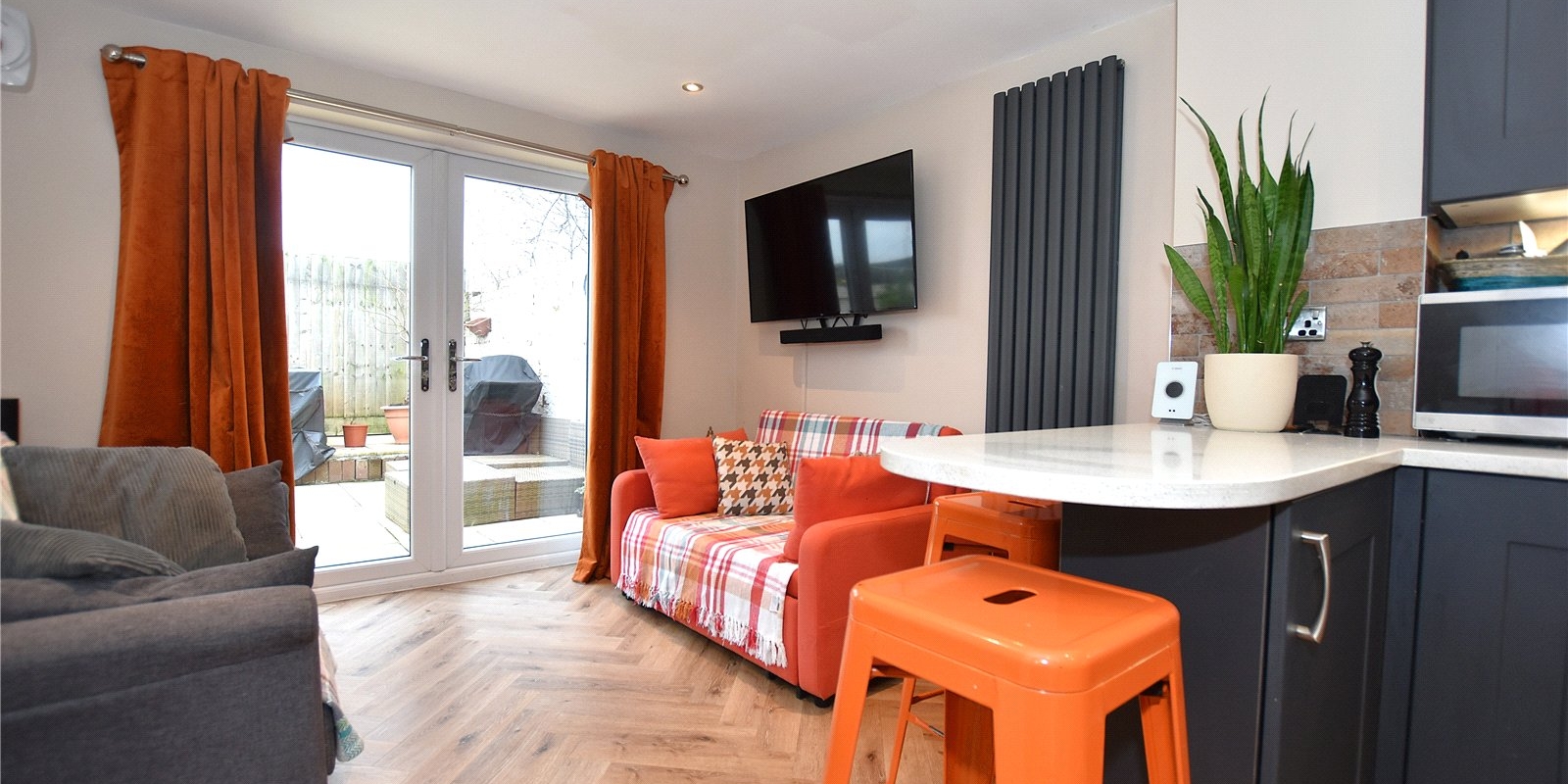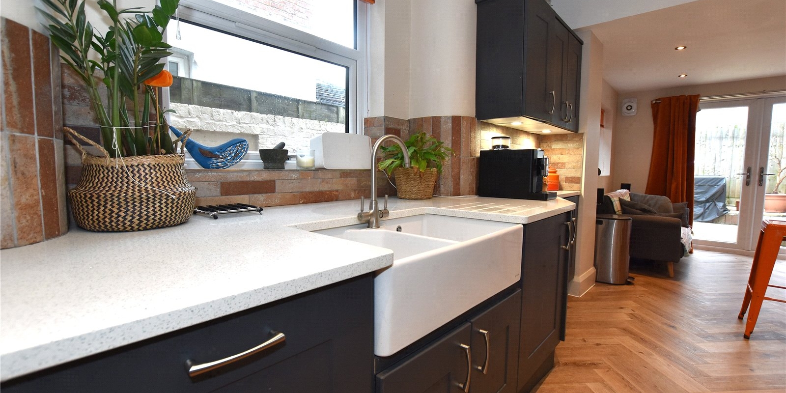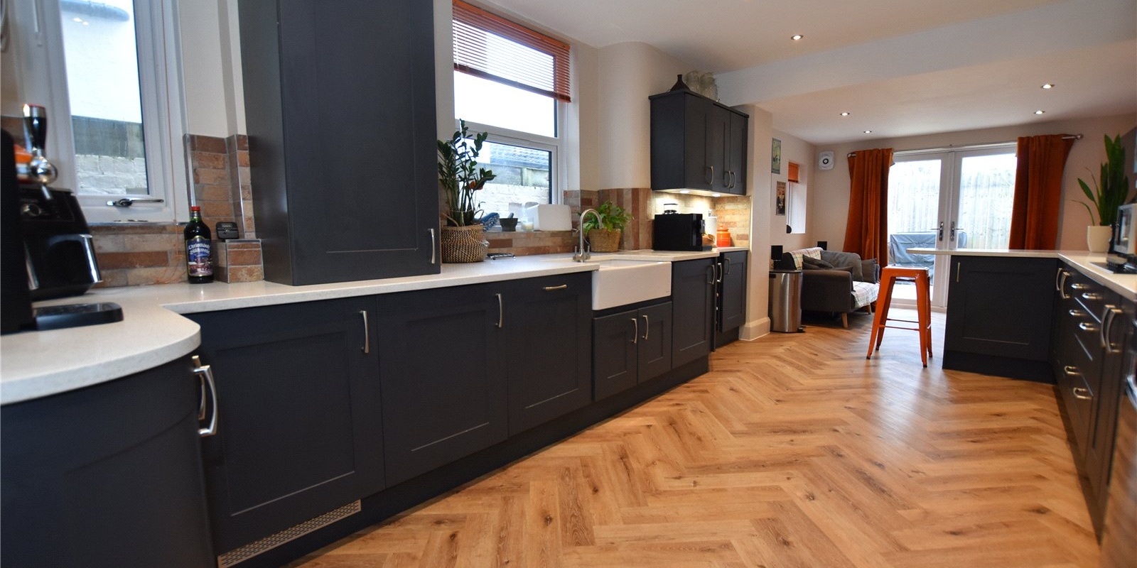 At the heart of the home is a stunning open-plan living kitchen, truly a family’s dream space. The contemporary design is complemented by a characteristic twist, featuring a classic Belfast sink, elegant quartz worktops, striking navy cabinetry and stylish herringbone flooring. Loft-style brick splashbacks run throughout the worktop areas, adding texture and an industrial edge that beautifully balances the classic features. With direct access out to the garden, the space offers seamless indoor–outdoor flow, perfect for entertaining and everyday family living.