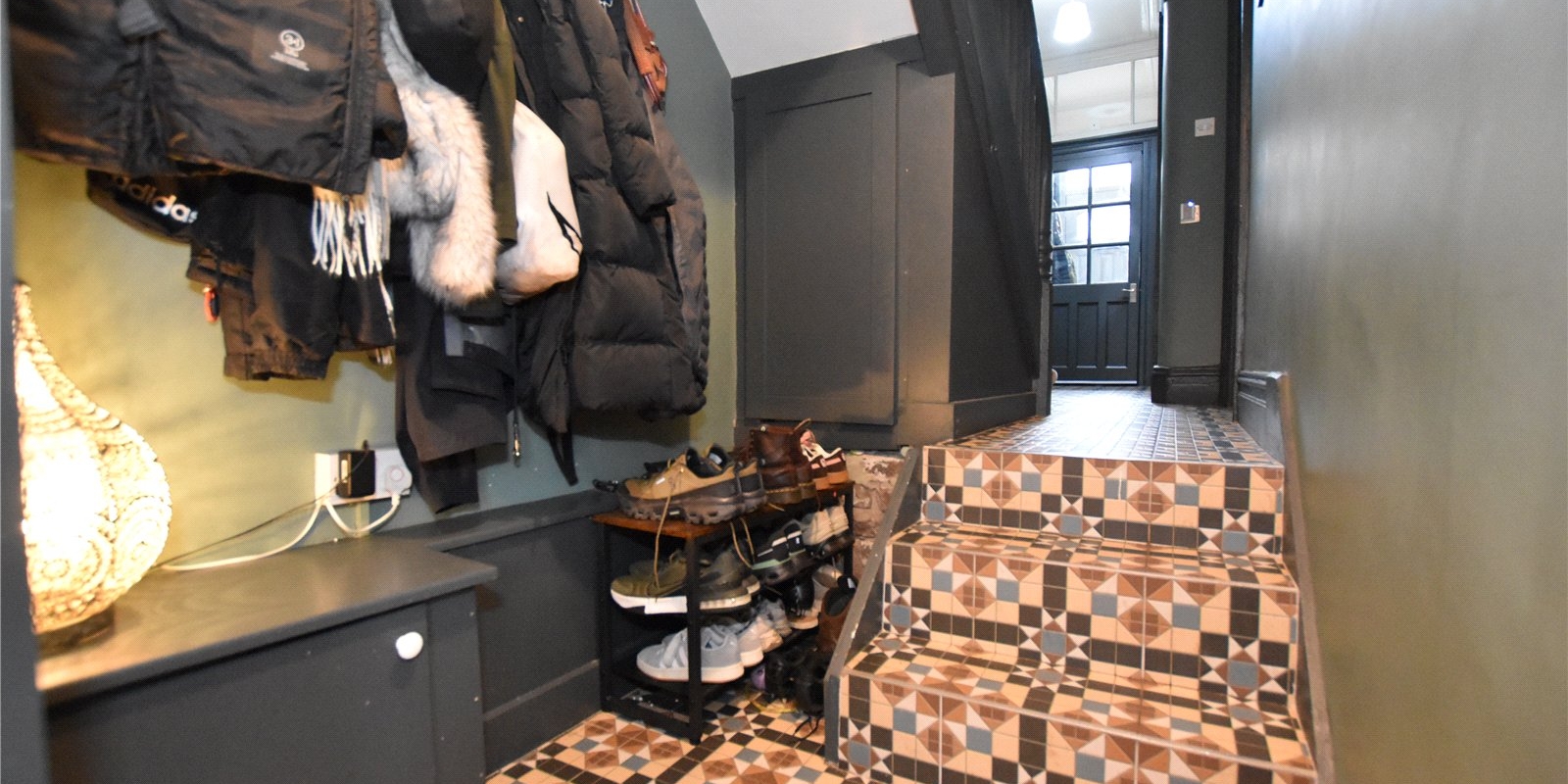 You are welcomed into the property via a useful front porch, providing excellent additional storage for coats and everyday essentials. The hallway itself makes an immediate impression with its attractive mosaic tiled floor and split-level staircase leading down into the kitchen, adding both character and architectural interest. Beneath the stairs, there is generous storage space ideal for shoes, coats and busy family life.