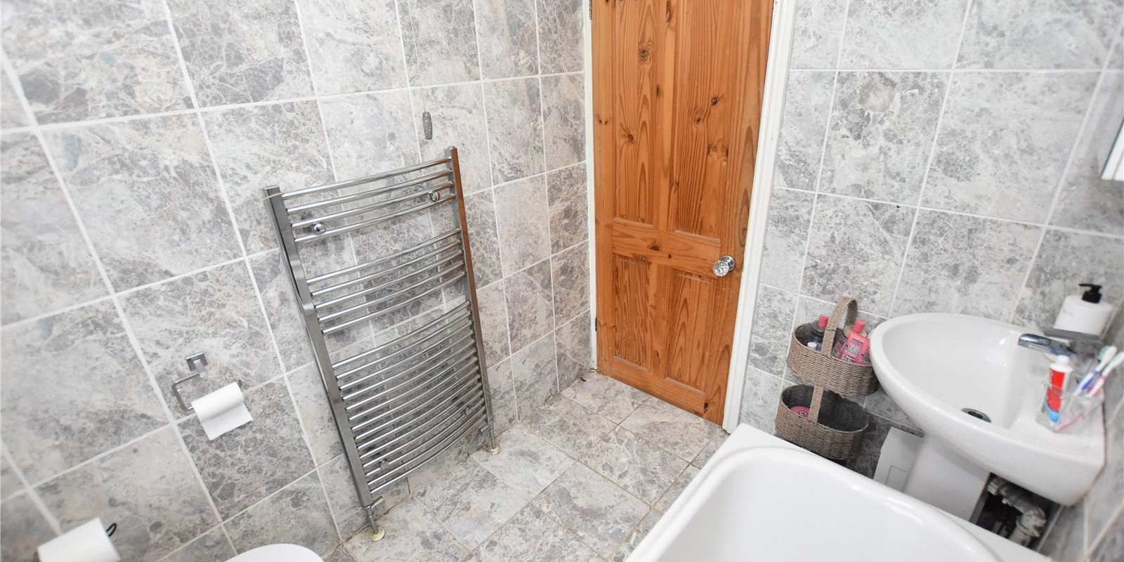 The bathroom is fully tiled and fitted with a modern suite to cater for family needs.