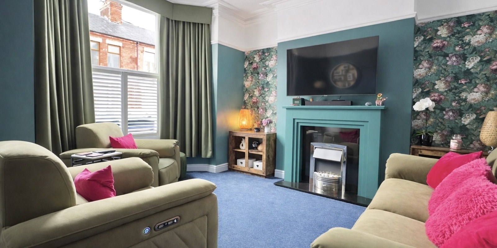 To the front of the property, the welcoming reception room features a beautiful bay window fitted with bespoke upvc blinds, a feature fireplace with a modern electric fire, plush carpeting and rich teal walls complemented by tasteful wallpaper. This cosy yet stylish room provides the perfect setting for relaxing with family.
