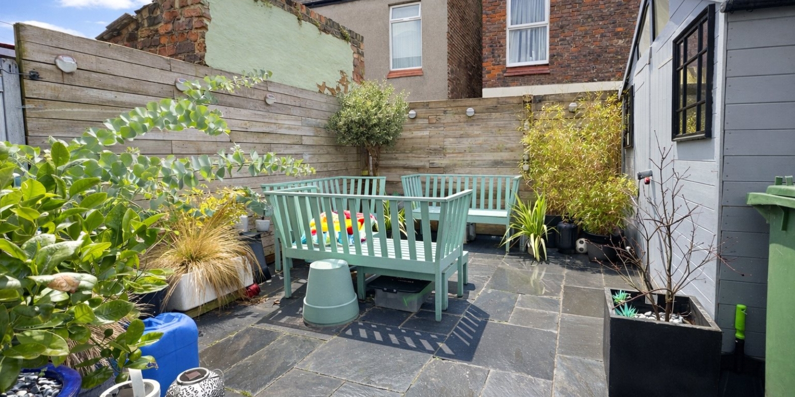 The landscaped courtyard has been thoughtfully designed with stylish grey slate patio tiles and rustic timber cladding to all surrounding walls, creating a contemporary yet warm outdoor space that is both private and low maintenance.