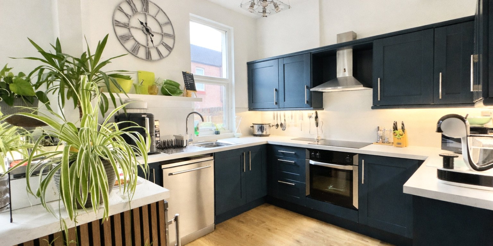 At the heart of the home is the showstopping open-plan living kitchen, thoughtfully designed for modern family living and entertaining. Featuring striking deep navy shaker-style cabinetry paired with marble-effect worktops, this impressive space is both practical and visually stunning. The kitchen includes dedicated space for a dishwasher and under-counter fridge and freezer, while the adjoining dining/living area is warmed by a charming log burner, creating a cosy atmosphere for family meals. Patio doors open directly onto a generously sized courtyard garden, allowing natural light to flood the room and creating a seamless indoor–outdoor flow.