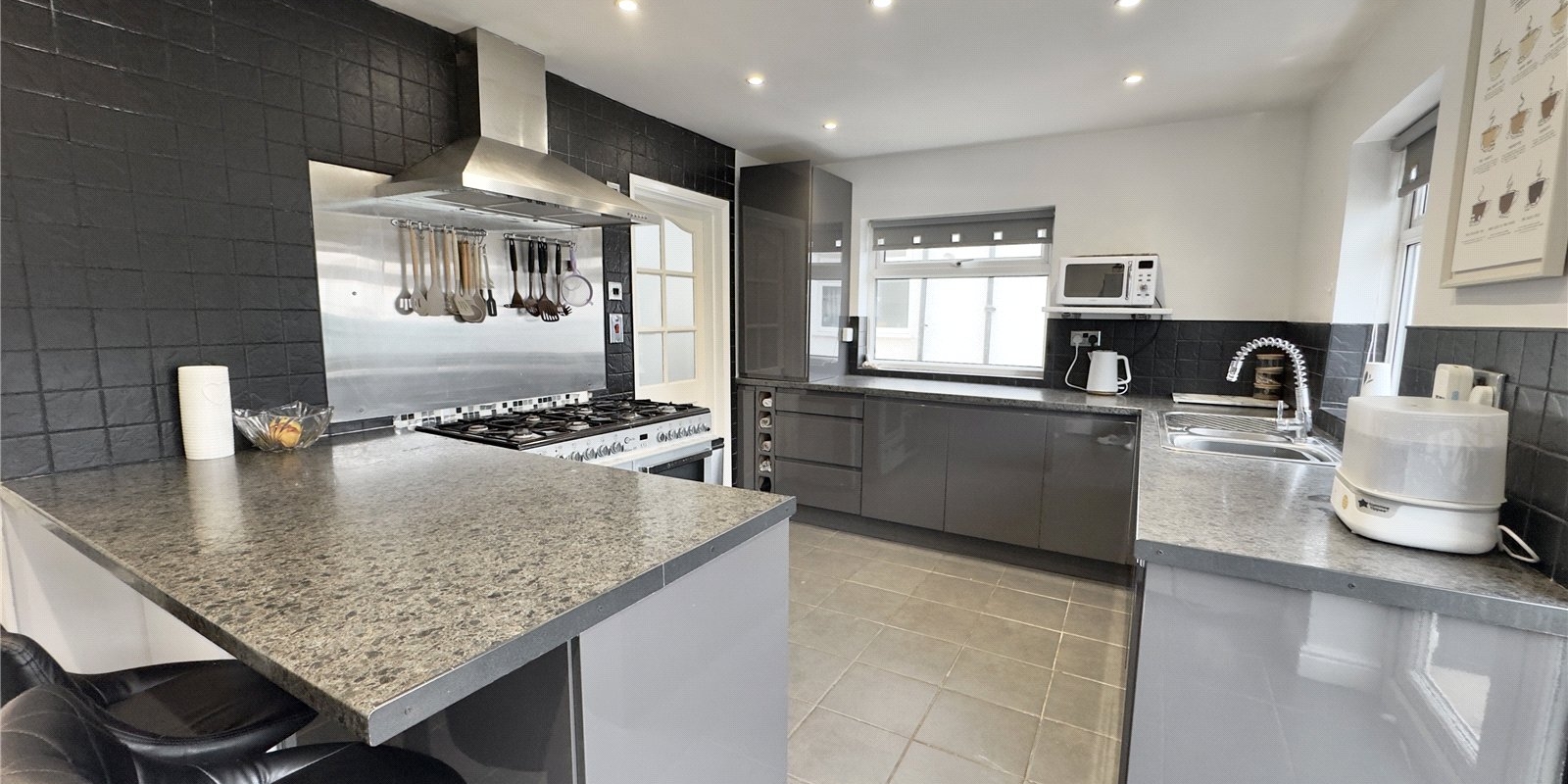 A breakfast bar provides a sociable spot for casual dining, while double doors open directly onto the rear garden, allowing for an abundance of natural light and easy indoor-outdoor living.