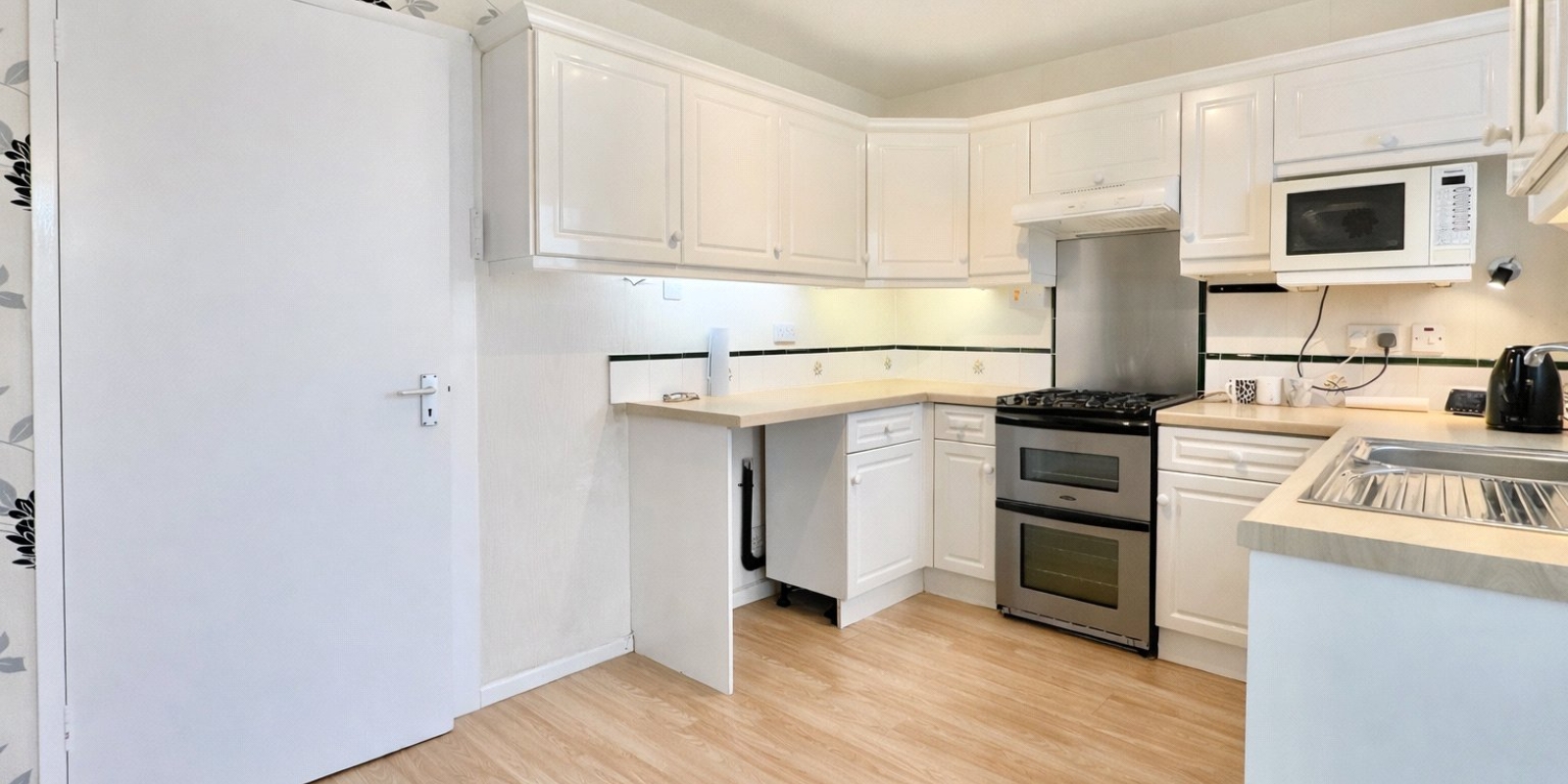 To the first floor, there are two well-proportioned bedrooms, both with storage, along with a landing cupboard housing the boiler and a modern white bathroom suite with a shower over the bath. The property enjoys an abundance of natural light throughout, further enhancing its warm and inviting feel.