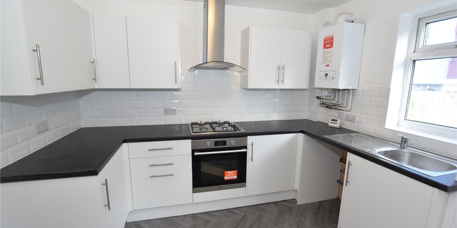 The accommodation briefly comprises a spacious entrance hallway, a bay-fronted lounge to the front, and a generous dining room flowing seamlessly into the kitchen. The kitchen is fitted with modern white cabinetry, complemented by black worktops and a stylish white tiled splashback. There are patio doors opening onto the courtyard accessed from the dining area.