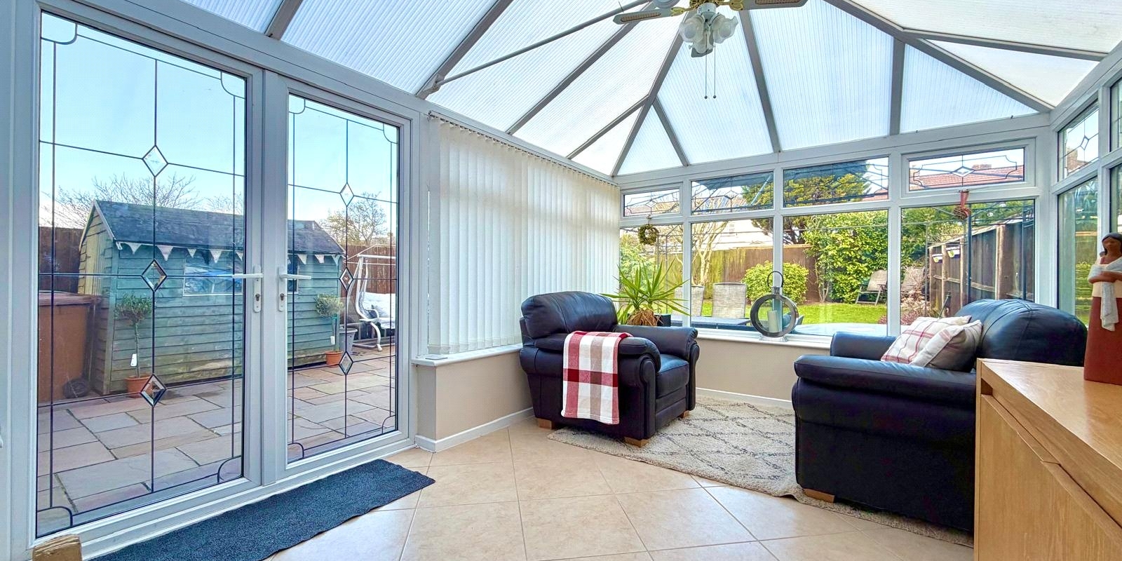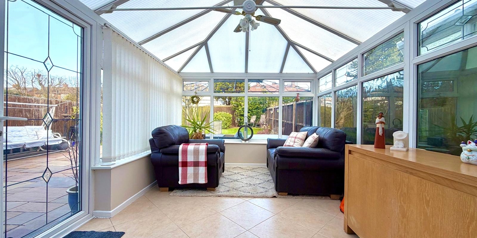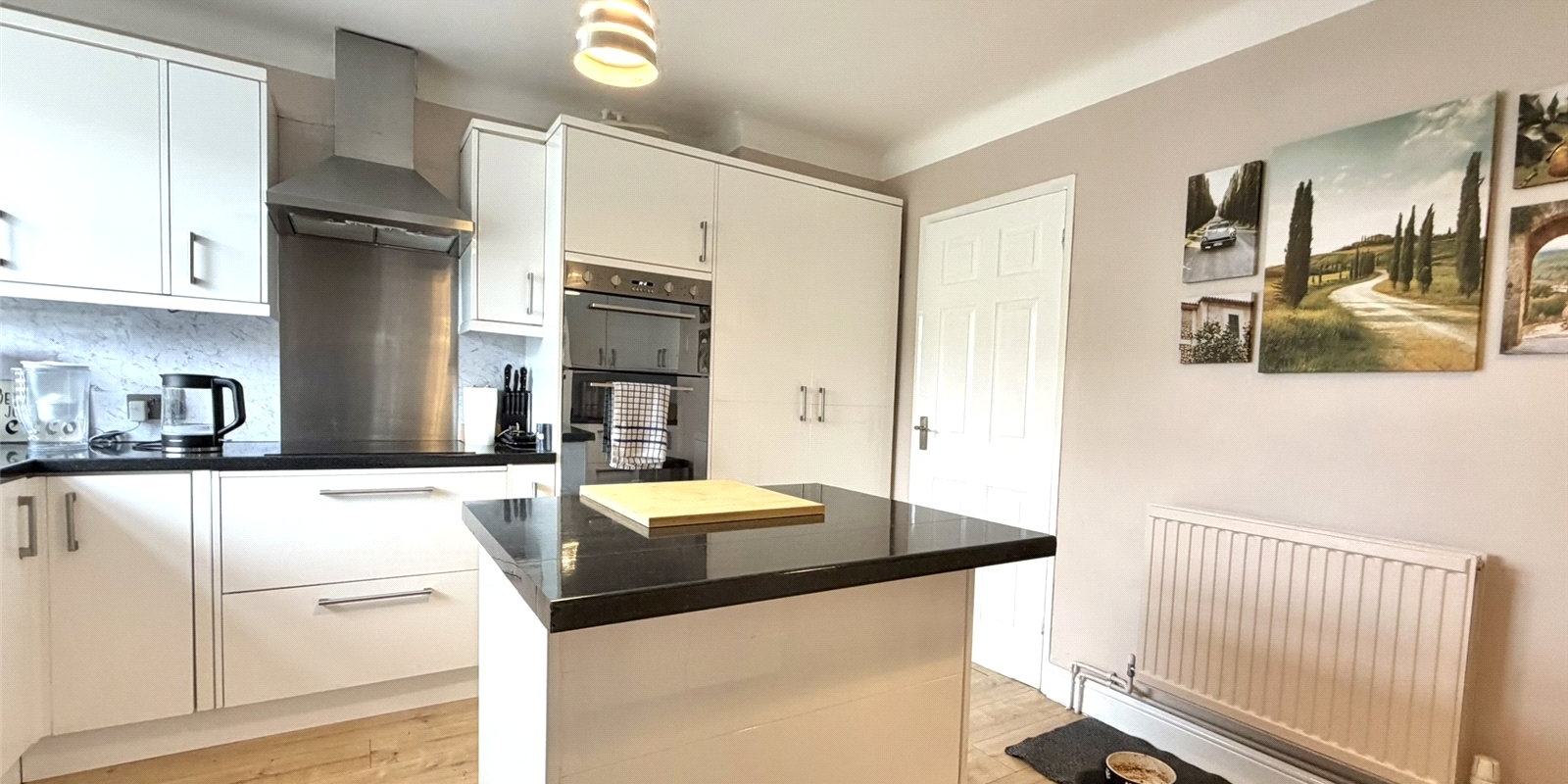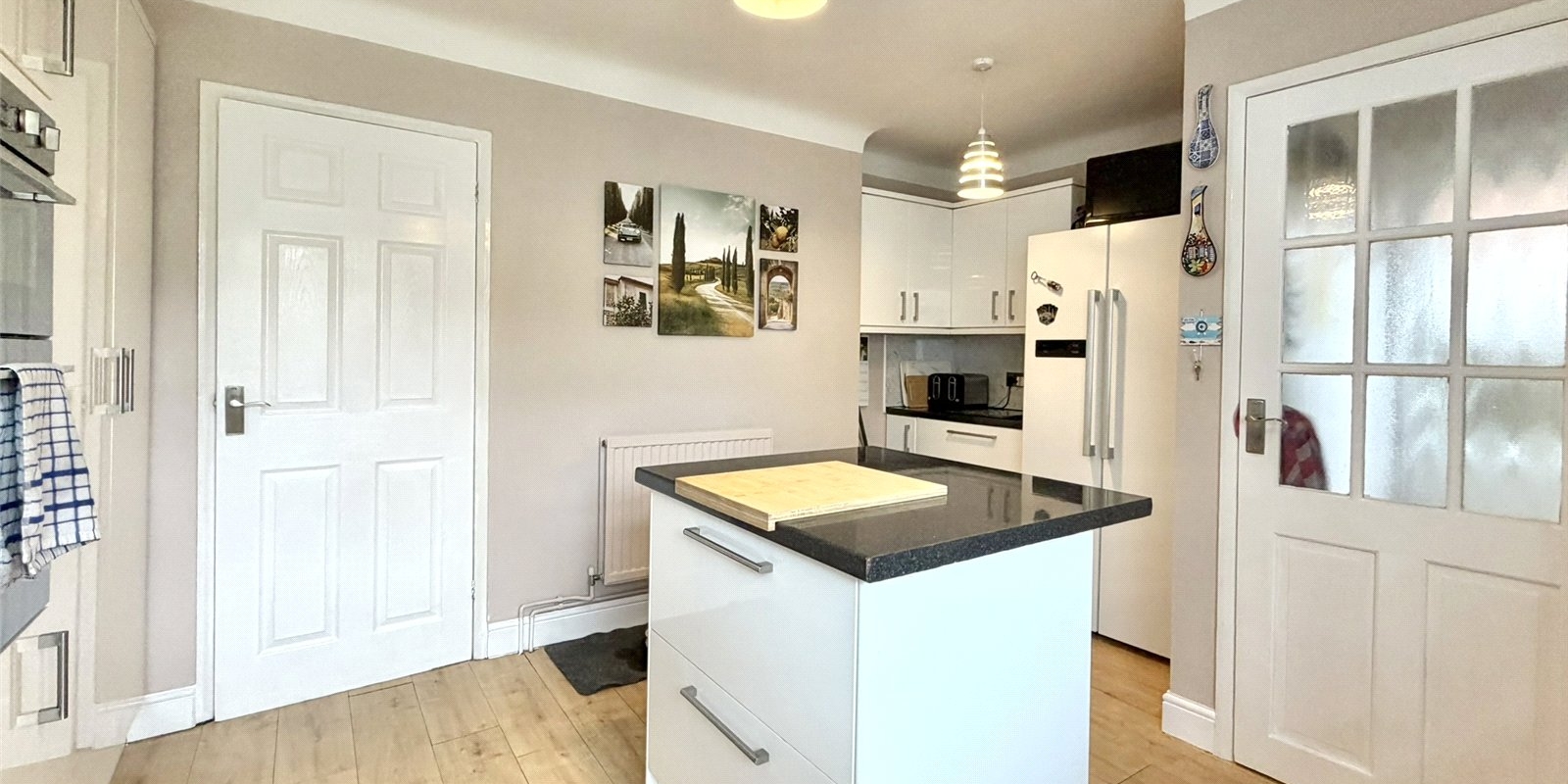 The property is approached via a driveway providing off-road parking for several vehicles, along with a garage. Internally, the accommodation begins with an entrance porch leading into a welcoming hallway. The ground floor boasts a spacious lounge, separate dining room and a large conservatory to the rear, creating excellent versatile living space ideal for entertaining or relaxing with family. The kitchen is fitted with a central island, providing both practicality and a sociable layout, and is complemented by a convenient downstairs WC.