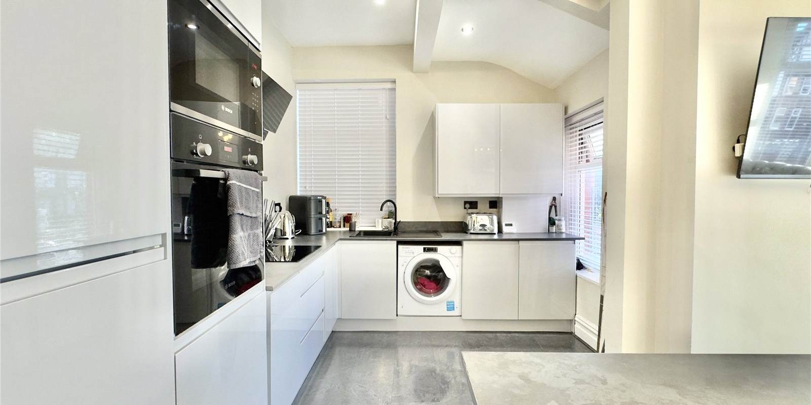 Upstairs, the property opens out into an impressive open-plan kitchen, dining and living area. Bathed in natural light from a striking bay window, this versatile space combines modern design with a sense of calm and openness. The newly installed kitchen features sleek grey cabinetry and a sizeable central island, perfect for relaxed meals or entertaining friends.