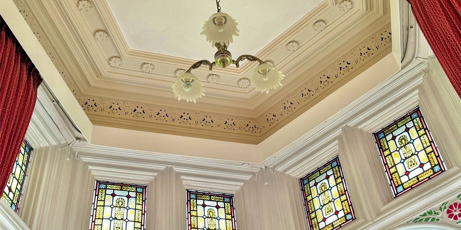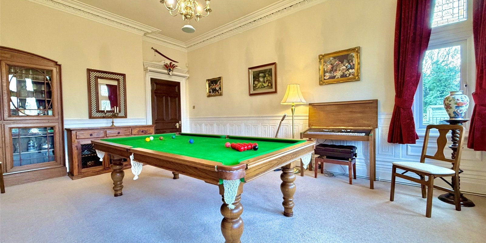 A second reception room offers a more intimate snug-style space, complete with original wood panelling, stained glass windows and a characterful feature fireplace, while the third reception room serves as an elegant formal dining room.