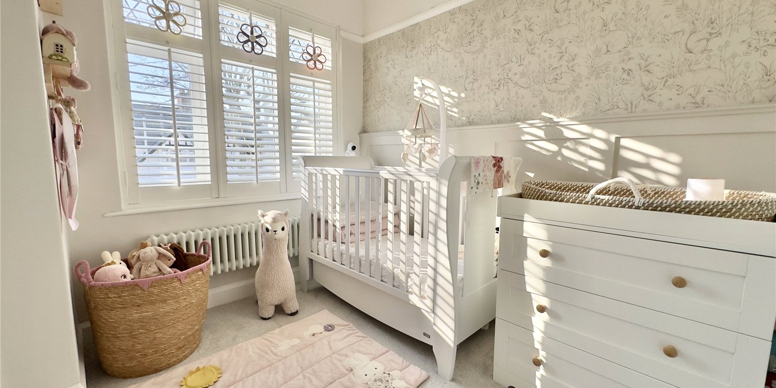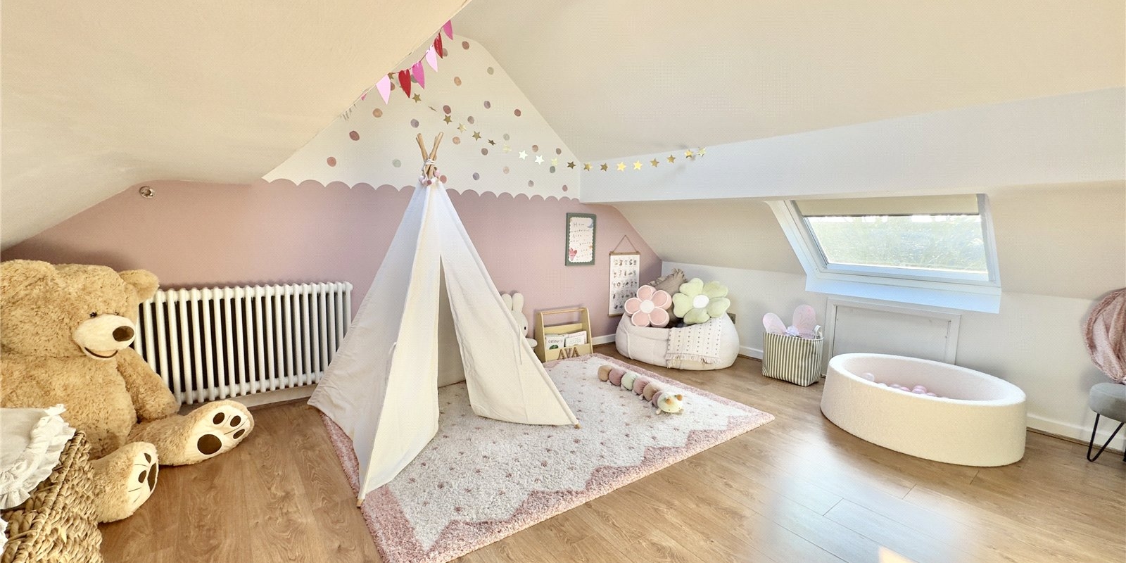 To the first floor are two generously sized double bedrooms, a further single bedroom and a sleek contemporary family bathroom. A staircase leads to the second floor where the fourth bedroom is currently utilised as a spacious playroom, offering flexibility for growing families or those needing a home office space.