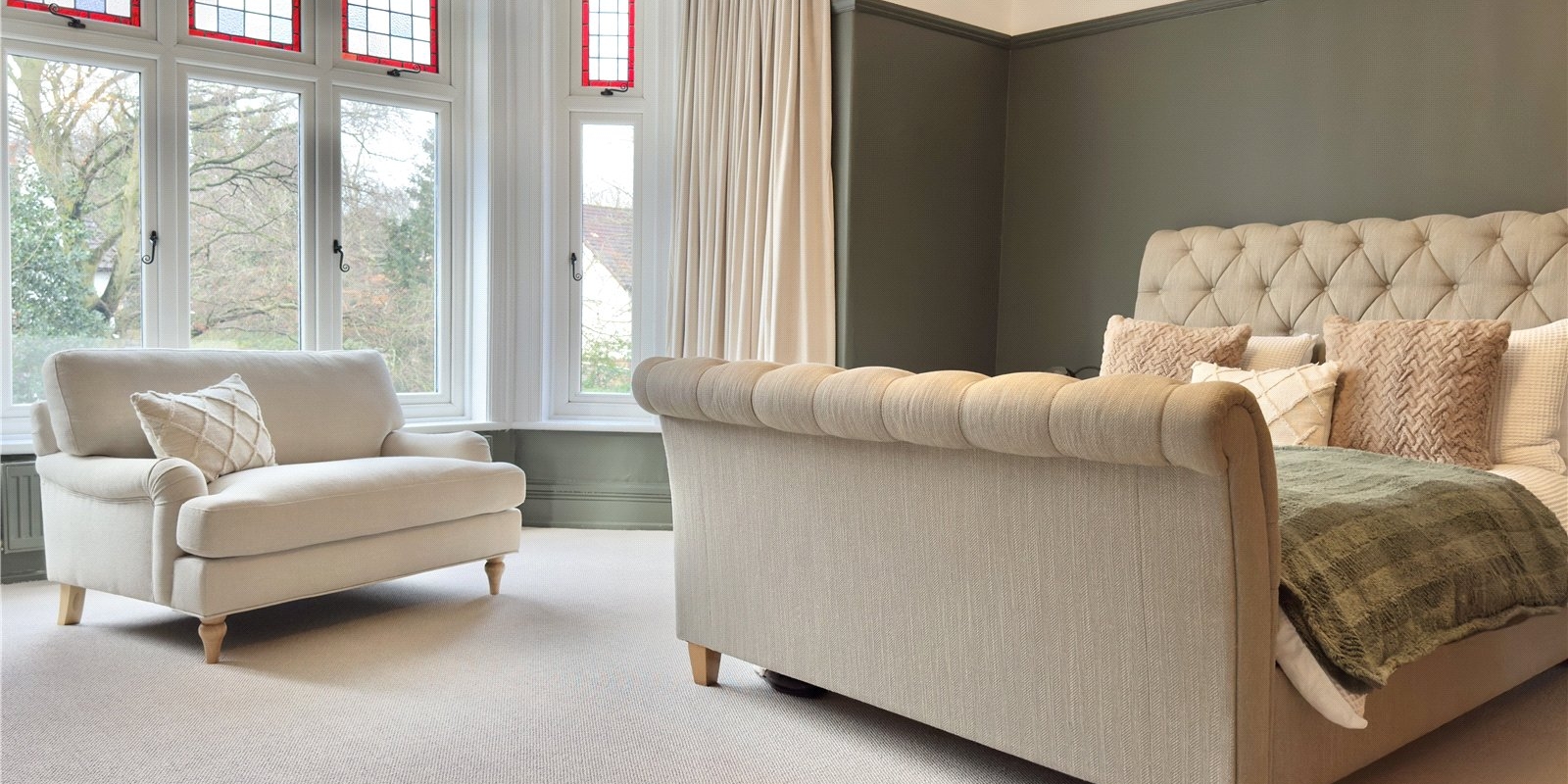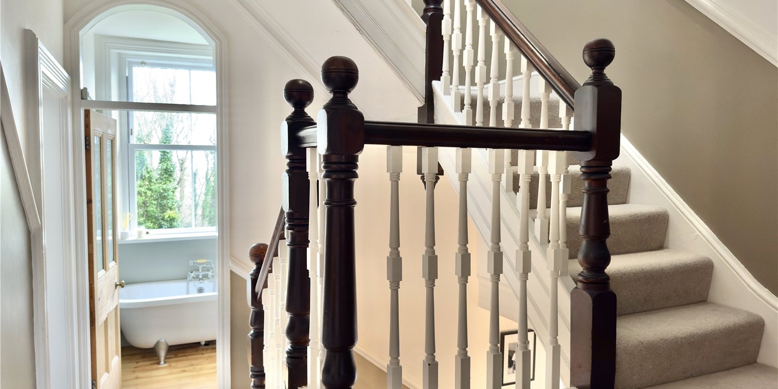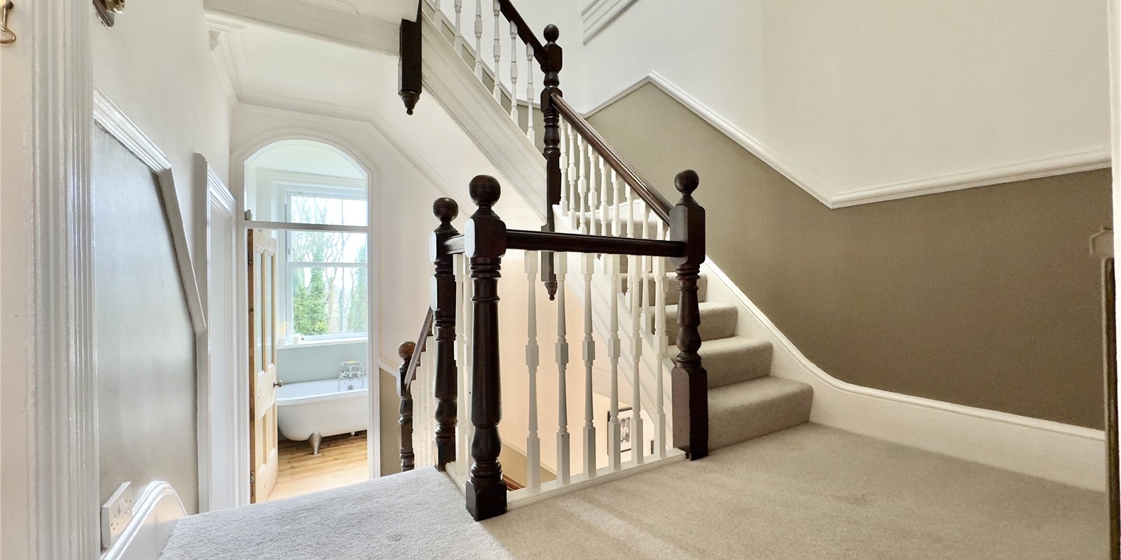The principal bedroom is a luxurious retreat, benefitting from a generous four-piece en-suite complete with a feature roll-top claw-foot bath. Two additional family bathrooms are thoughtfully positioned on the half landings, serving five further exceptionally spacious bedrooms, with the top-floor rooms offering particularly grand proportions.