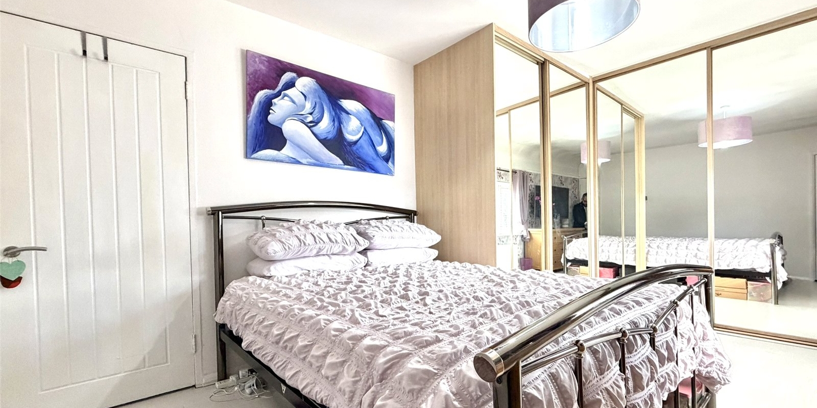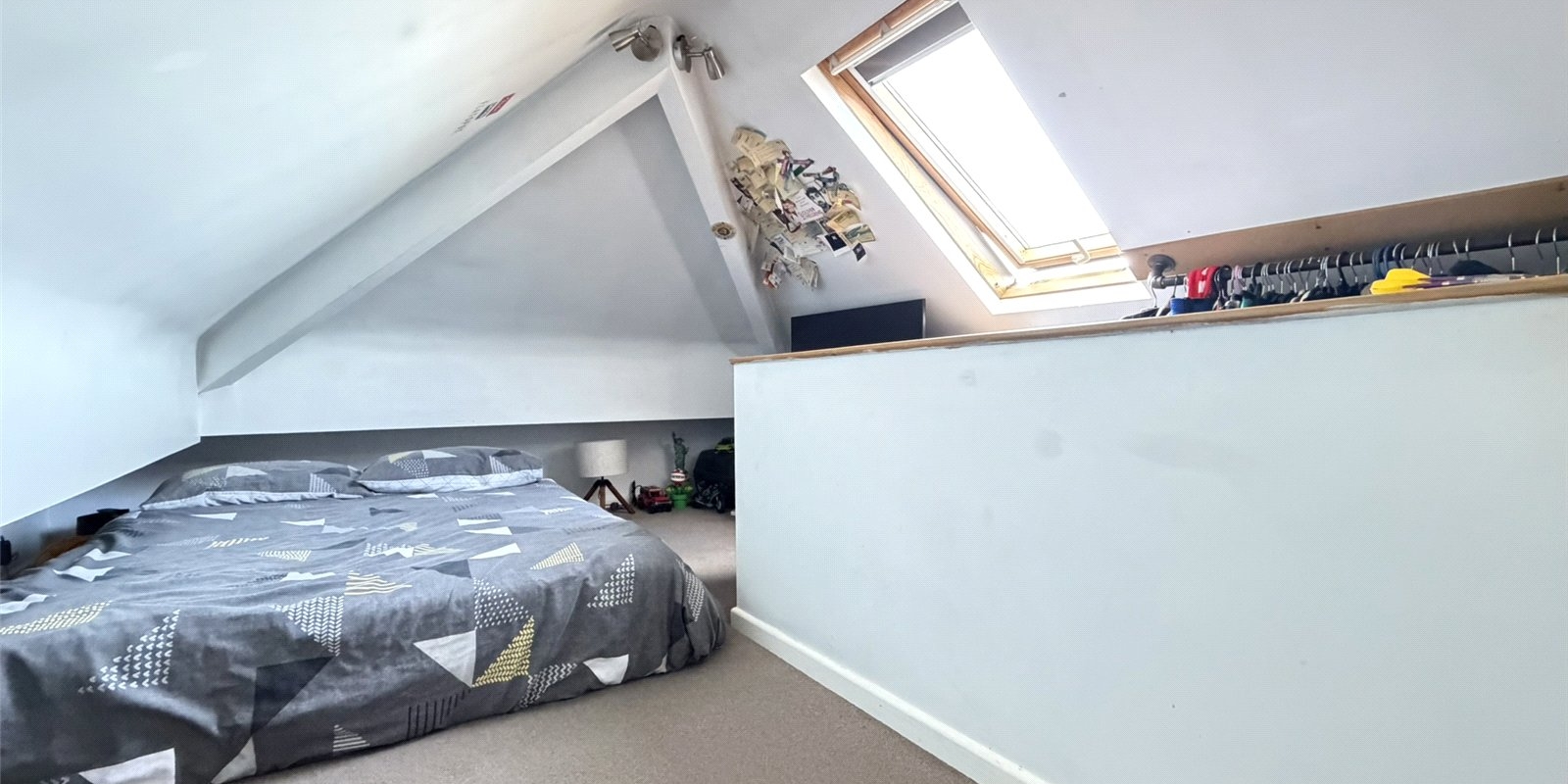 To the first floor are two well-proportioned double bedrooms, including a master bedroom with built-in wardrobes, alongside a stylish and contemporary family bathroom. From the landing, a further door leads to a staircase rising to the loft room, complete with Velux window and radiator, currently used as a third bedroom and offering excellent versatility for buyers.