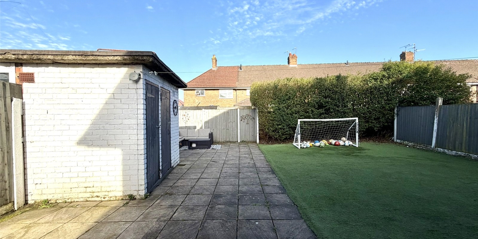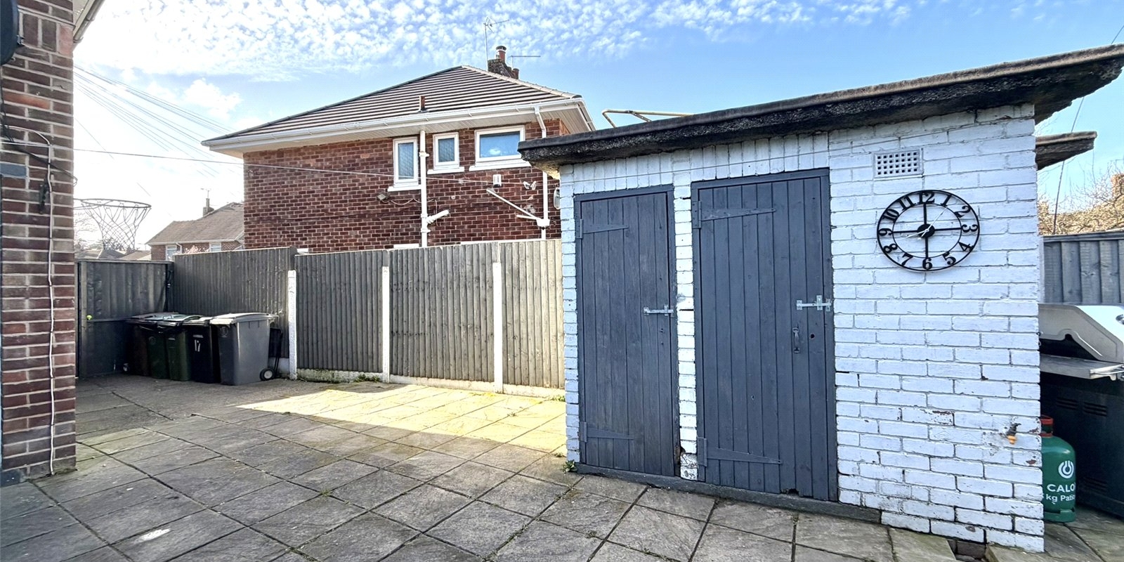 • Generous wedge-shaped garden with lawn, patio & outbuilding