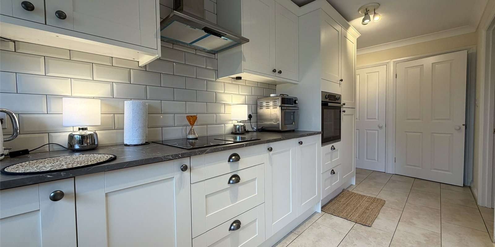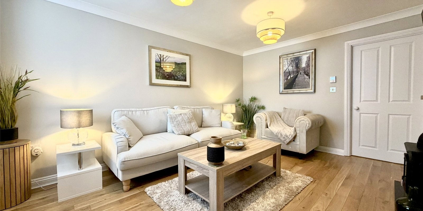 Internally, the property welcomes you with a stylish entrance hallway featuring contemporary acoustic wall panelling and ambient lighting, setting the tone for the quality found throughout. A convenient downstairs WC and staircase lead from the hallway, with access into a bright and airy lounge complete with engineered wood flooring and a feature electric fireplace. To the rear, the home opens into a stunning kitchen/dining/living space, designed in a modern country style and ideal for entertaining, complemented by a useful utility room and understairs storage. Double French doors lead seamlessly onto the landscaped rear garden.