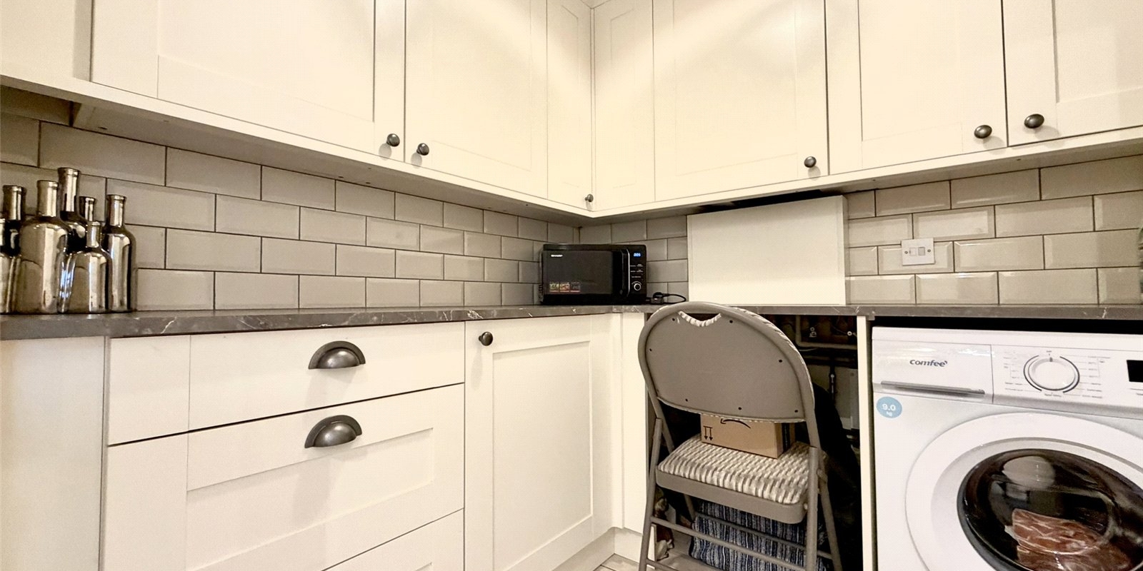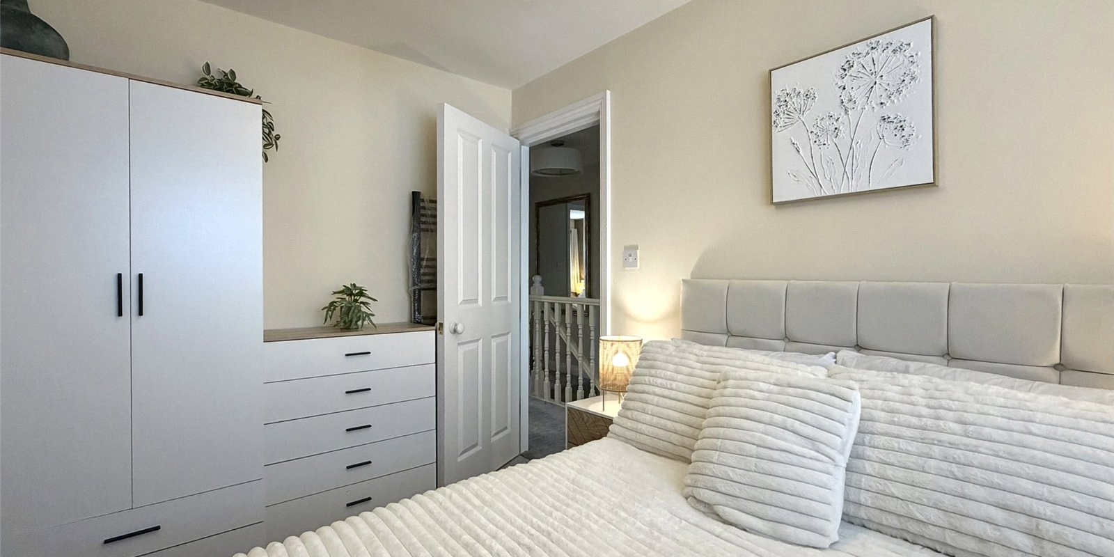 Upstairs, the spacious landing provides access to three well-proportioned bedrooms. The principal bedroom spans the full width of the property and benefits from dual aspect windows overlooking the garden, bespoke fitted wardrobes, and feature acoustic panelling. The second bedroom is a generous double with feature wall, while the third is a well-sized single. A modern family bathroom completes the first floor.