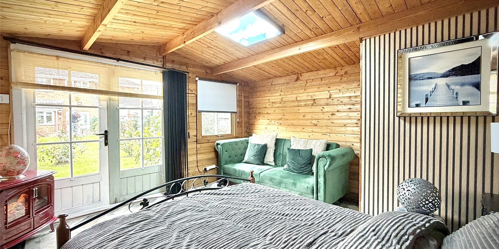 Externally, the rear garden has been thoughtfully landscaped to create a contemporary and low-maintenance outdoor space, with planted shrubs and borders. A standout feature is the fully powered outbuilding, currently utilised as an occasional bedroom, offering versatility as a home office, gym, or summer house. The property also enjoys a private rear aspect, backing onto school playing fields and not being directly overlooked. To the front, there is a driveway providing off-road parking for two vehicles.