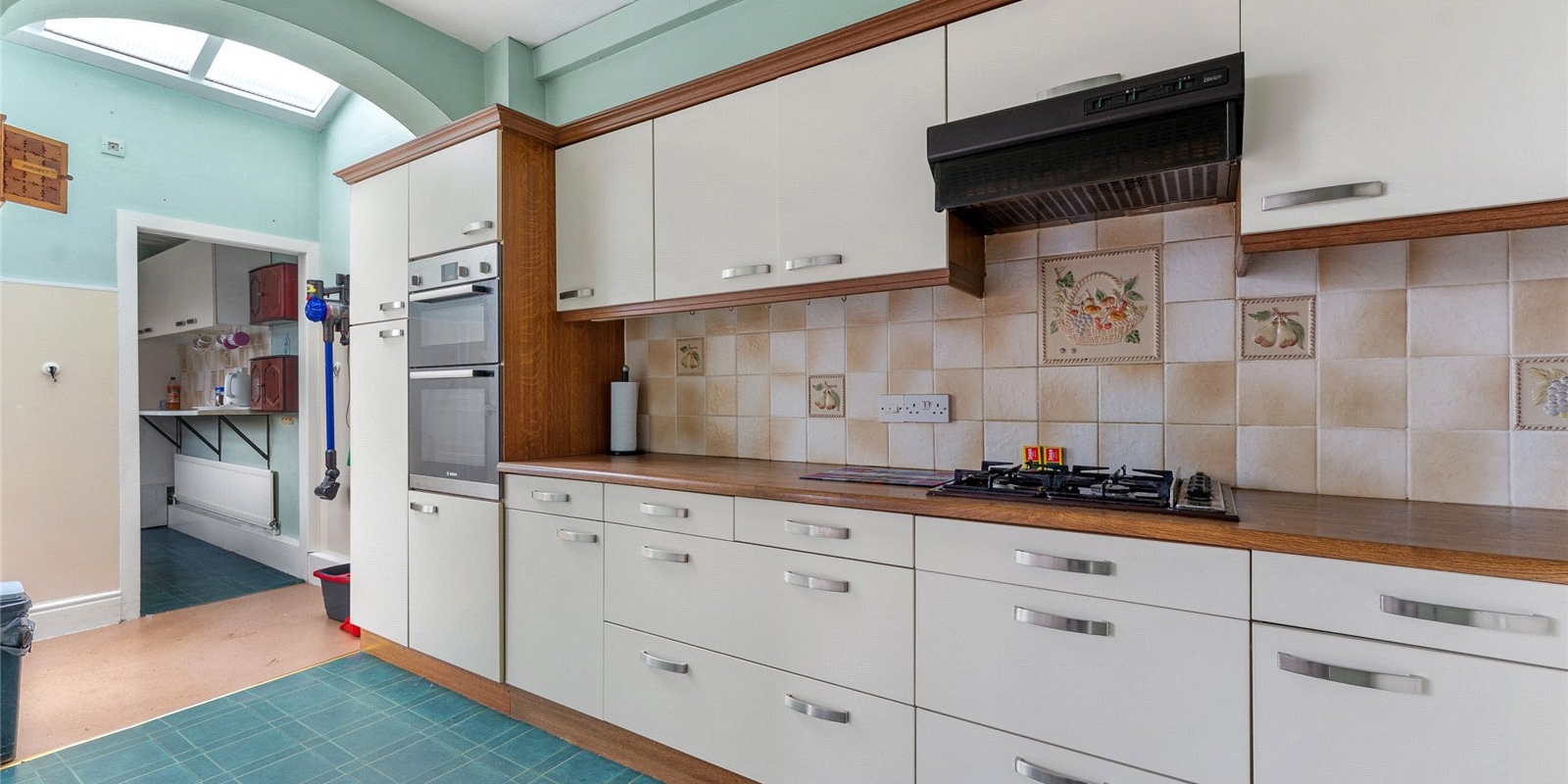 The kitchen is fitted with a range of wall and base units and finished with practical vinyl flooring. This space flows seamlessly into a useful utility room, while a UPVC patio door opens directly onto the rear garden, inviting in plenty of natural light.
