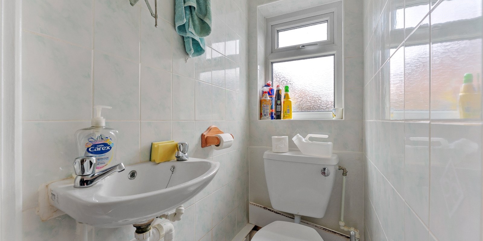 The family bathroom features a contemporary two-piece white suite, while a separate WC adds convenience for busy households. A UPVC window provides natural light and ventilation.