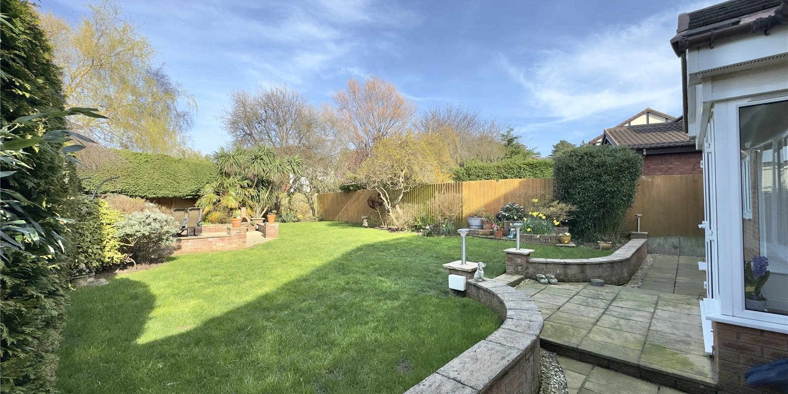 Outside, the mature garden is a particular highlight, featuring well-maintained lawns, established shrubs, and several thoughtfully positioned seating areas. This outdoor sanctuary offers multiple spaces for relaxation and entertainment throughout the seasons.