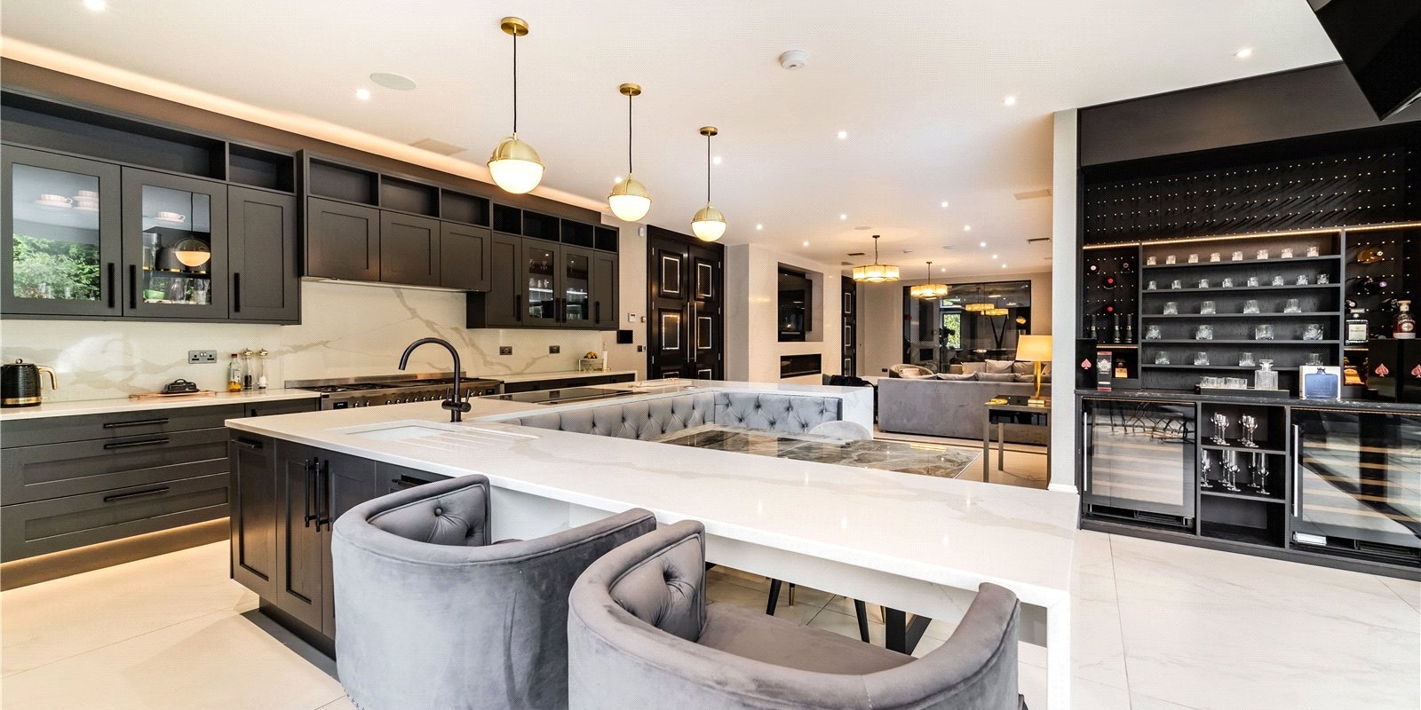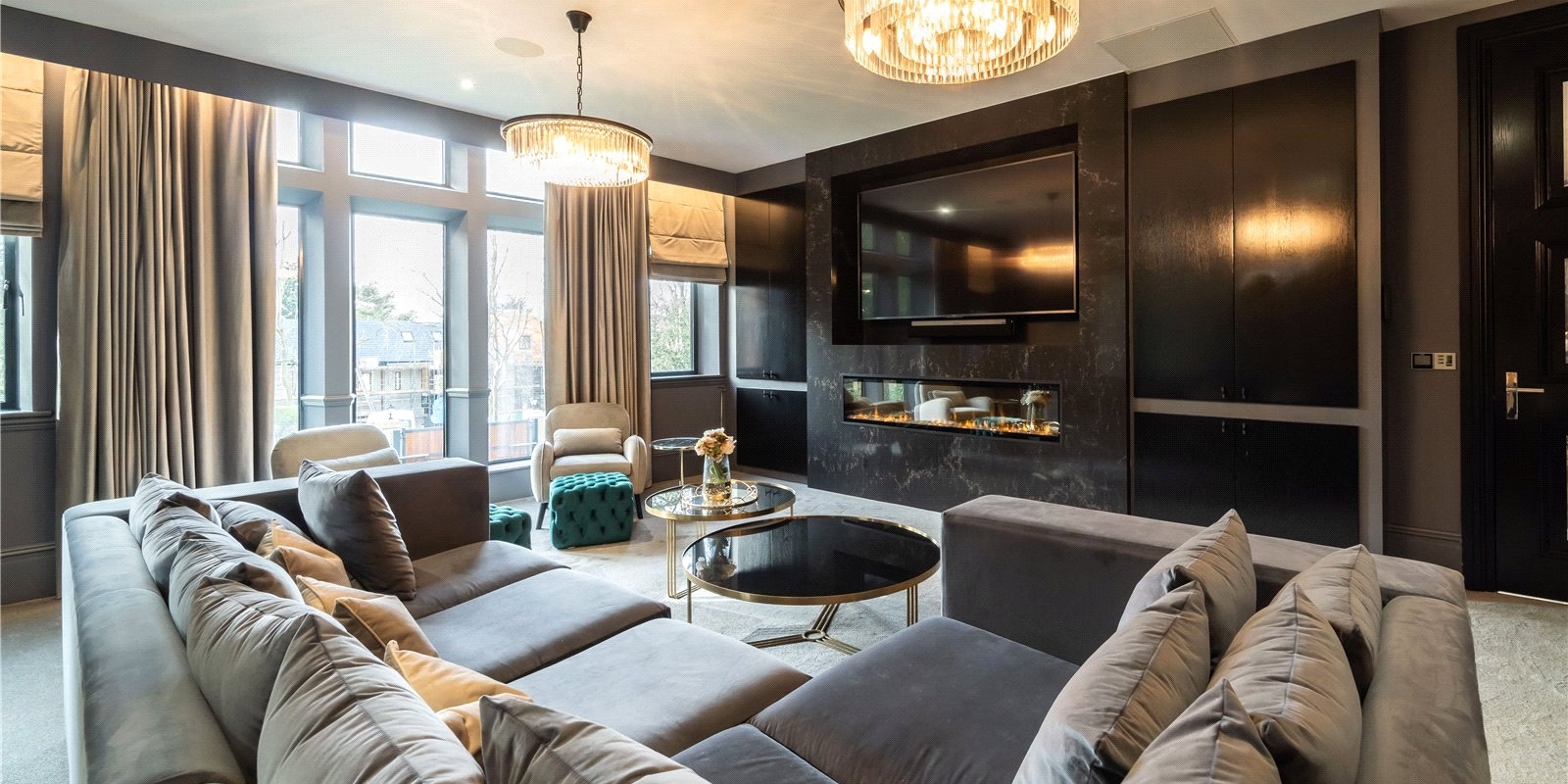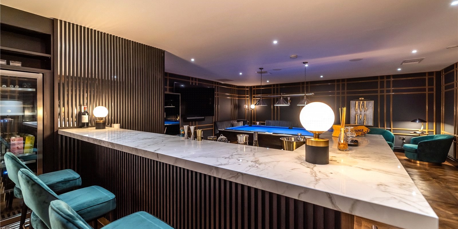 Internally, one is drawn to the bold material palette and inspried entrance. In summary, the ground floor features a grand entrance hallway, formal lounge, study, playroom, utility room, and W.C. The breathtaking and luxurious open-plan family living kitchen diner boasts a wealth of superior fixtures and fittings. Additionally, the ground floor provides access to a stunning leisure suite, including a spacious gym, swimming pool with bar area, sauna, steam room, and shower room.