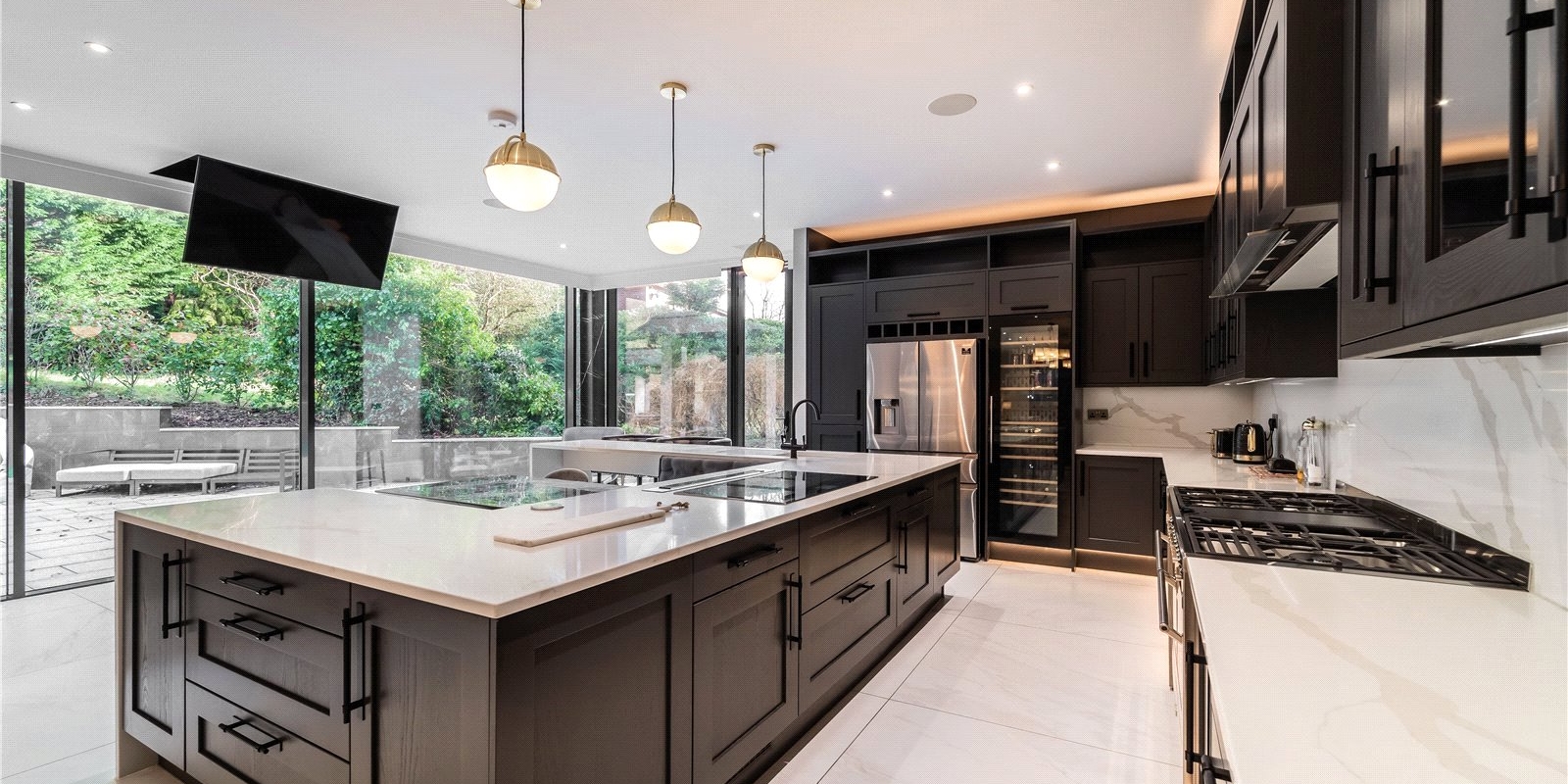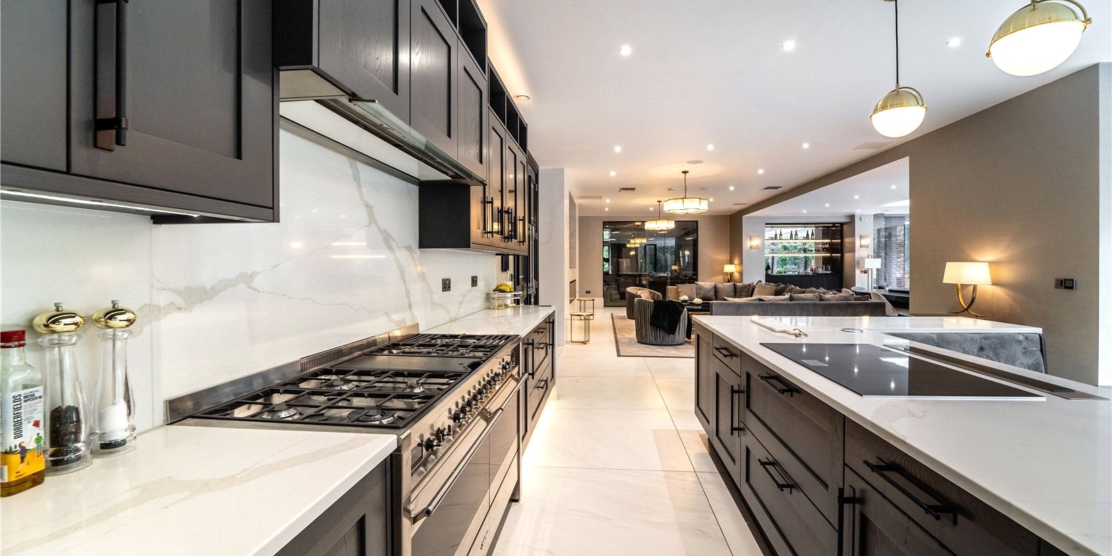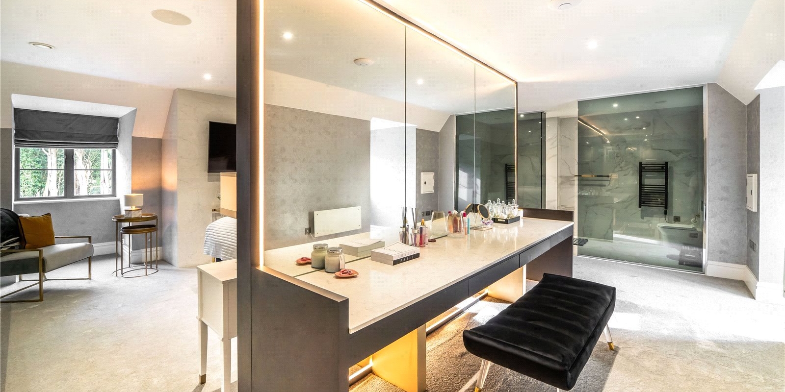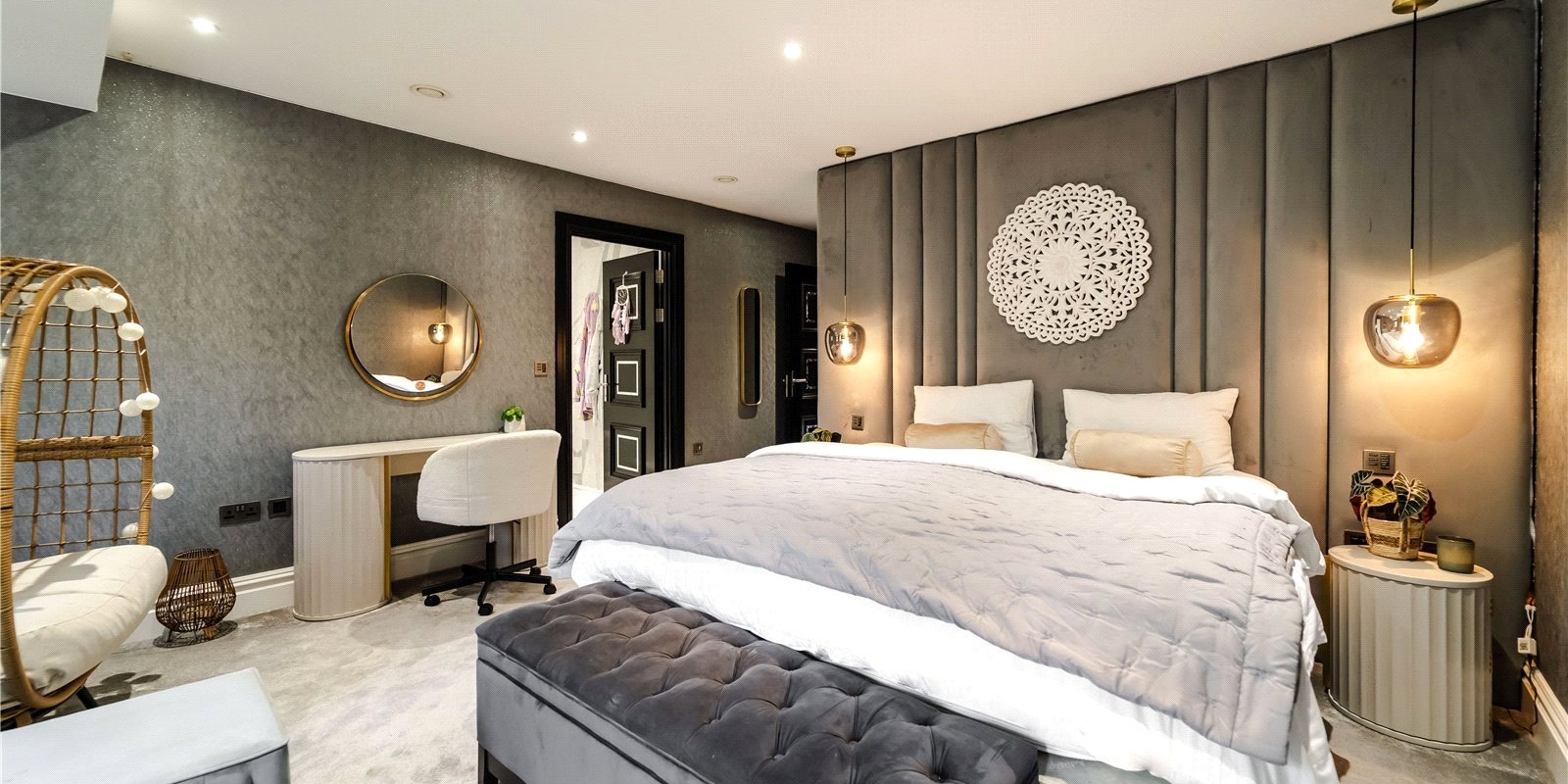Internally, one is drawn to the bold material palette and inspried entrance. In summary, the ground floor features a grand entrance hallway, formal lounge, study, playroom, utility room, and W.C. The breathtaking and luxurious open-plan family living kitchen diner boasts a wealth of superior fixtures and fittings. Additionally, the ground floor provides access to a stunning leisure suite, including a spacious gym, swimming pool with bar area, sauna, steam room, and shower room.