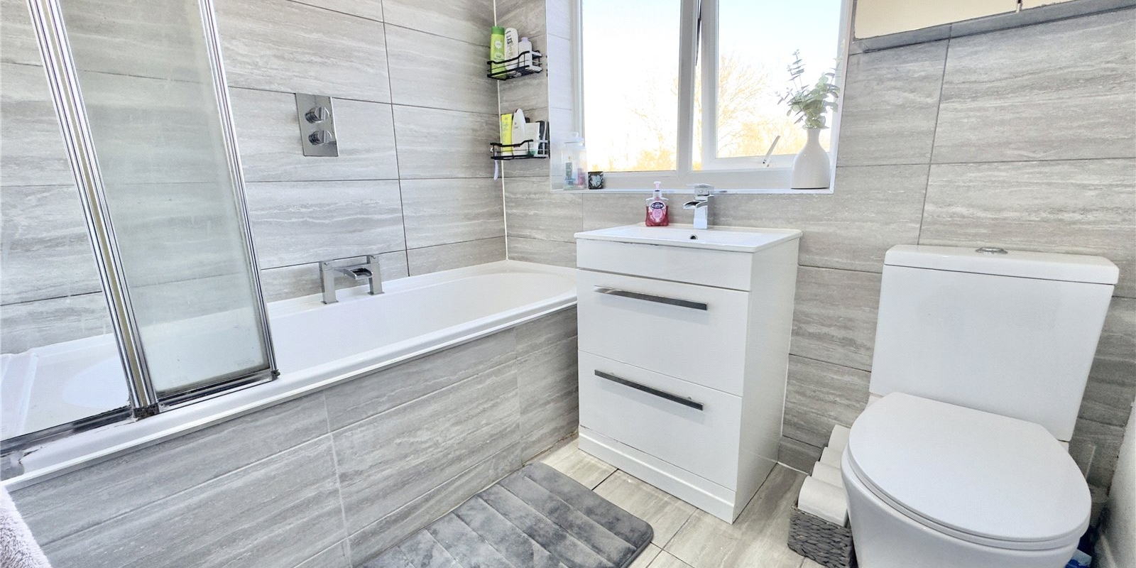 Upstairs, the home continues to impress with three well-proportioned bedrooms. Two generous double bedrooms provide comfortable and restful spaces, while the third bedroom offers flexibility as a child’s room, nursery, or home office. These are complemented by a sleek and modern family bathroom featuring a contemporary three-piece suite with a shower over the bath.