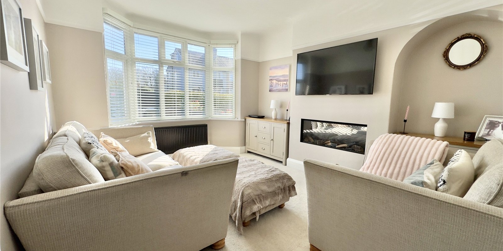 Inside the home immediately feels warm, welcoming and thoughtfully cared for. The entrance hallway leads into a charming front lounge where a large bay window fills the room with natural light, while a wood-effect fire creates a focal point for those cosy evenings.