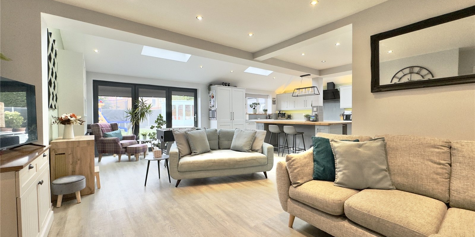 The rear of the property is undoubtedly the showpiece of the home, designed with both entertaining and everyday living in mind. The impressive extended open-plan kitchen, dining, and snug area creates a sociable hub where family and friends can gather. The stylish kitchen features a central island, perfect for casual breakfasts, coffee mornings, or hosting, along with integrated appliances and ample workspace for keen cooks. The snug area, complete with a wood-burning stove, provides a warm and inviting space during colder months, while the bi-folding doors open fully onto the garden, allowing for seamless indoor-outdoor living in the summer, ideal for barbecues, celebrations, or simply enjoying the sunshine. A separate utility room adds practicality and keeps the main living space clutter-free.