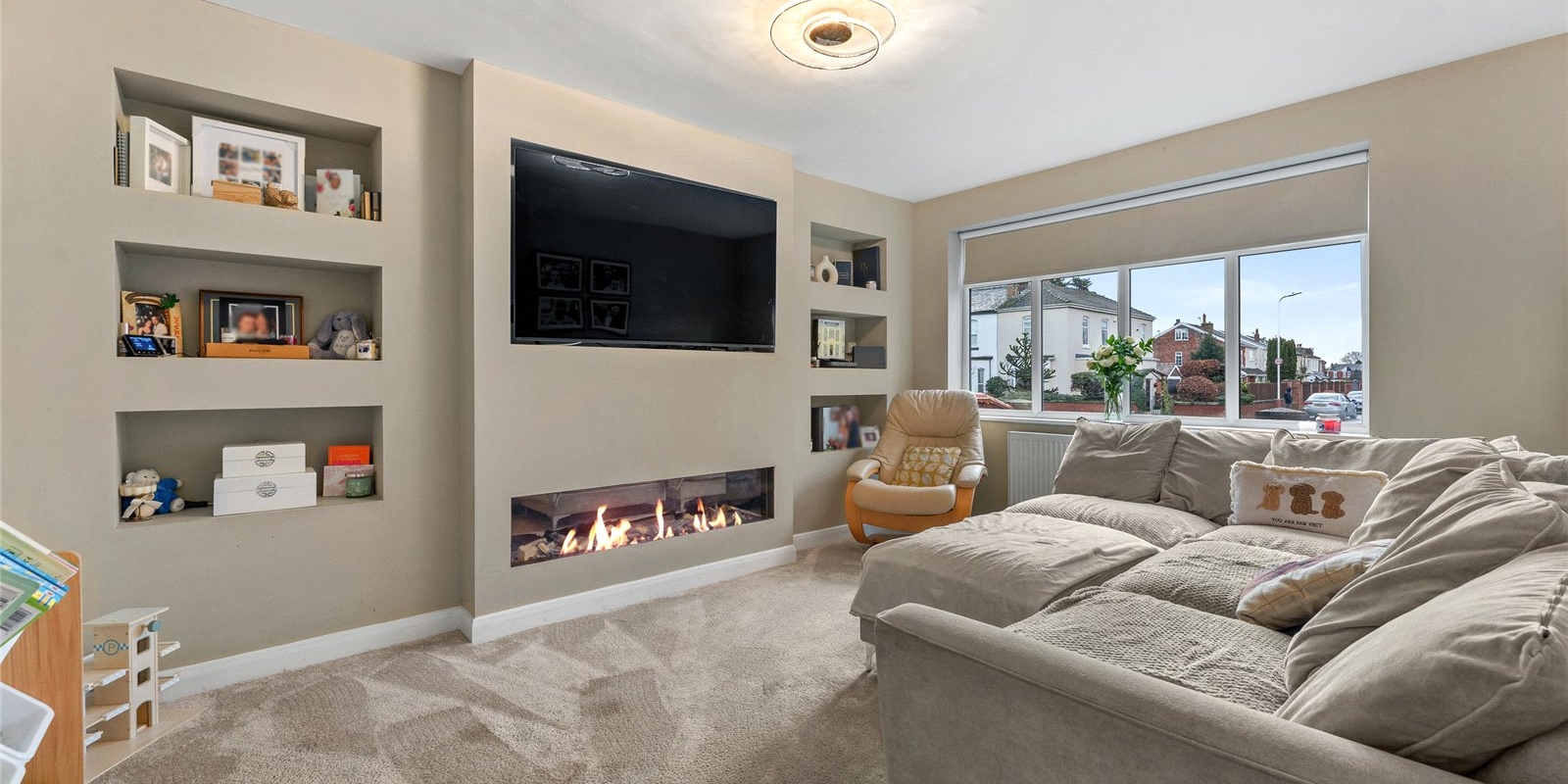 The ground floor begins with a large welcoming entrance hall and convenient downstairs WC, leading through to a separate front living room featuring a striking contemporary media wall and integrated fireplace, creating a warm yet modern space ideal for relaxing.